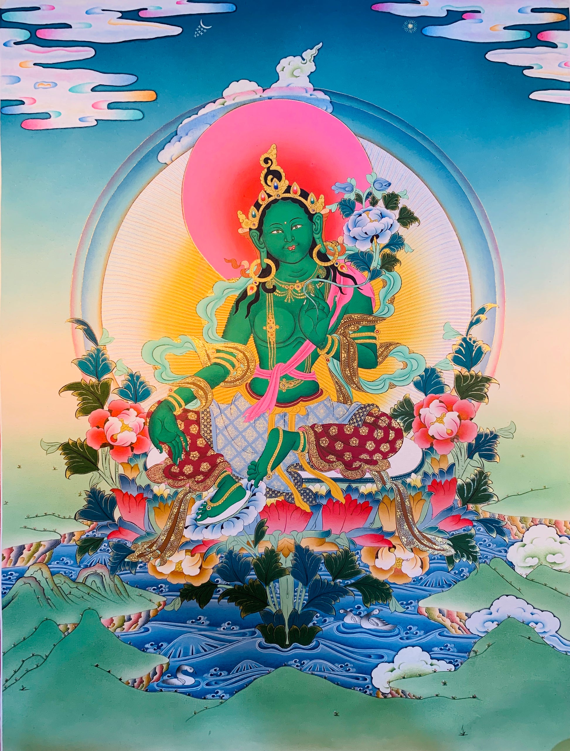 这幅美丽的手绘西藏唐卡画描绘了绿度母སྒྲོལ་ལྗང་。绿度母被视为一切菩萨之母,爱护一切众生。她与开明的活动有关,帮助人们超越尘世的存在。绿度母会庇护一切可能阻碍或引起麻烦的事物。她还体现了“女性”的许多品质,被称为慈悲之母,从恶业中解脱出来。