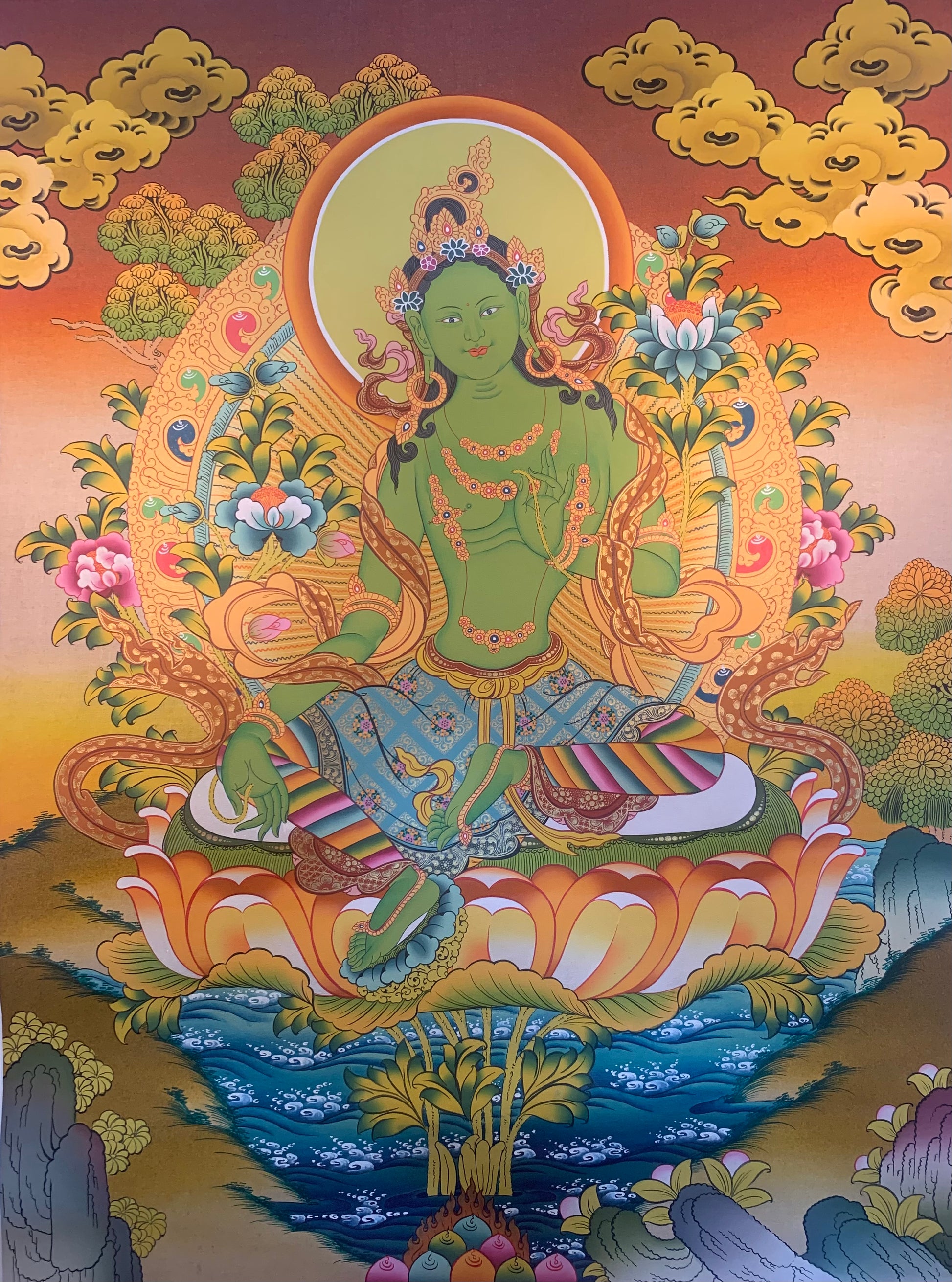 This beautiful hand painted Tibetan thangka painting depicts Green Tara སྒྲོལ་ལྗང་. Green Tara is regarded as the mother of all Bodhisattvas, a lover of all sentient beings. She is associated with enlightened activity, helping people pass beyond earthly existence. Green Tara grants refuge from all things which may obstruct, or cause trouble. She also embodies many qualities of the ‘feminine’, known as the mother of mercy and compassion, giving relief from bad karma.