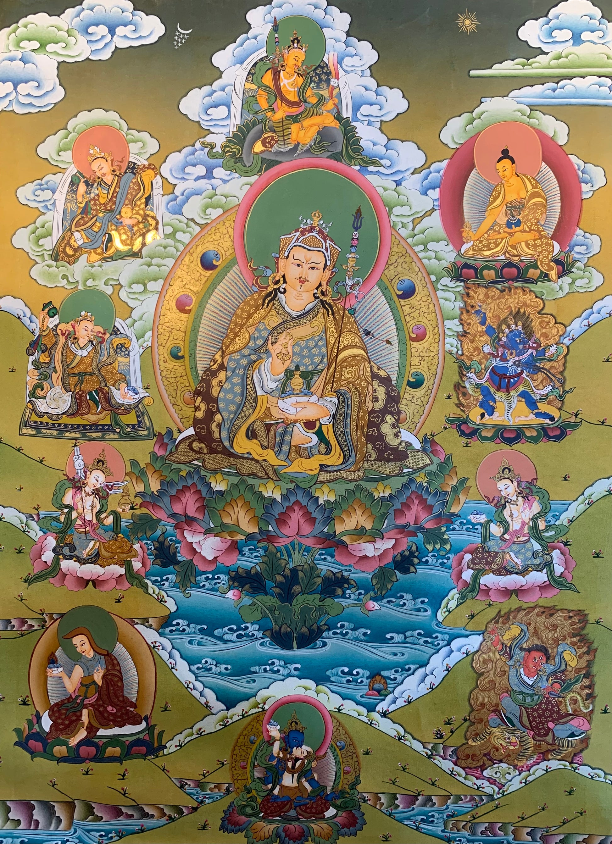 This beautiful hand painted Tibetan thangka painting depicts Guru Rinpoche གུ་རུ་རིན་པོ་ཆེ། (the Precious Guru), also known as Guru Padmasambhava པདྨ་འབྱུང་གནས། (Lotus born). Around the main image are the Eight Manifestations of Guru Rinpoche གུ་རུ་མཚན་བརྒྱད་ with his two main female disciples, Yeshe Tsogyal ཡེ་ཤེས་མཚོ་རྒྱལ་ (to his right) and Mandarava མནྡཱ་ར་བ་.