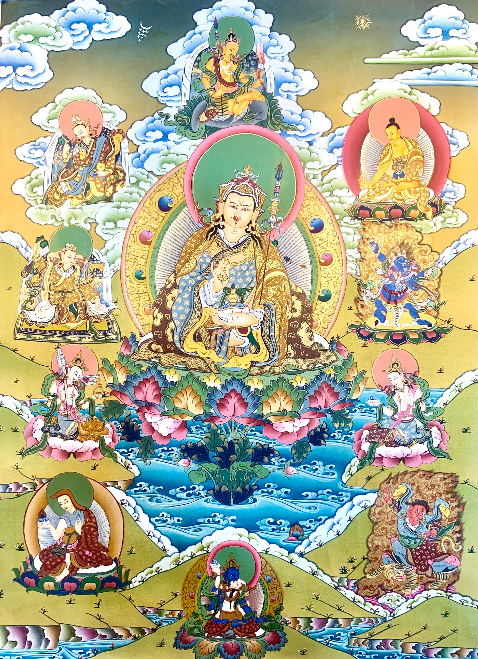 This beautiful hand painted Tibetan thangka depicts Guru Rinpoche གུ་རུ་རིན་པོ་ཆེ། (the Precious Guru), also known as Guru Padmasambhava པདྨ་འབྱུང་གནས། (Lotus born).