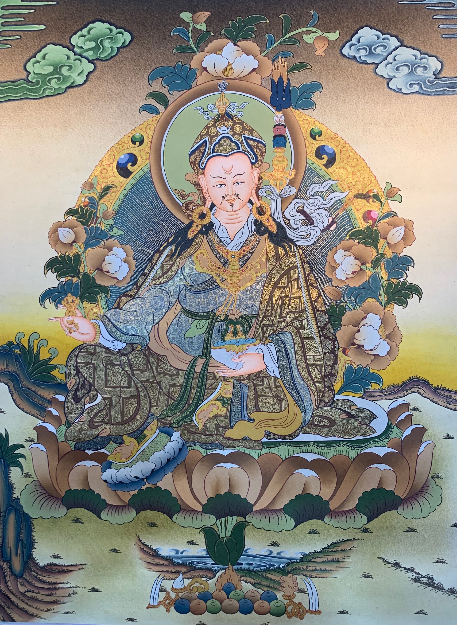 这幅美丽的手绘西藏唐卡描绘了莲花生大师གུ་རུ་རིན་པོ་ཆེ། (上师),又名莲花生大士པདྨ་འབྱུང་གནས། (莲花生)。