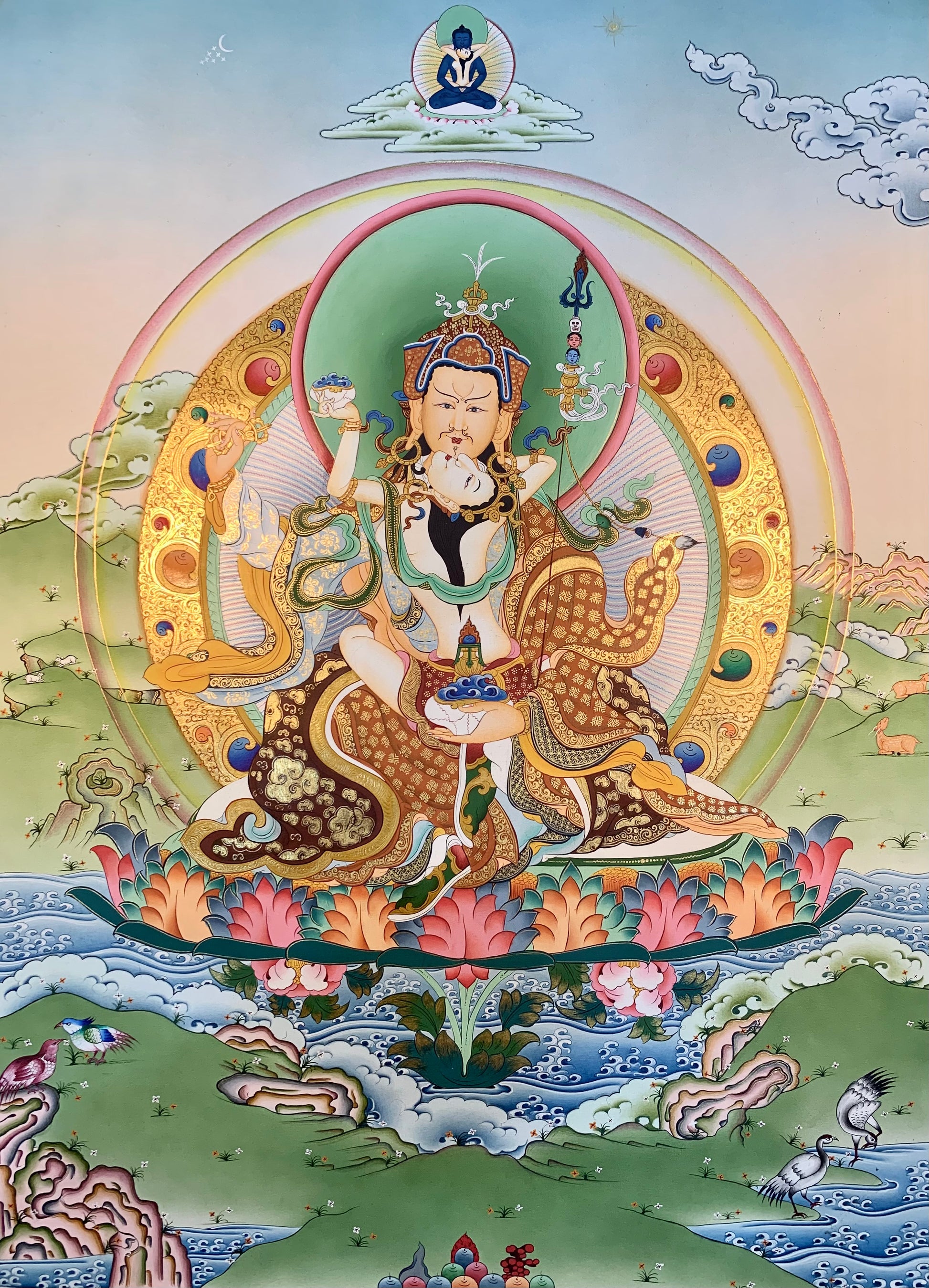This beautiful hand painted Tibetan thangka depicts Guru Rinpoche གུ་རུ་རིན་པོ་ཆེ། (the Precious Guru), also known as Guru Padmasambhava པདྨ་འབྱུང་གནས། (Lotus born).