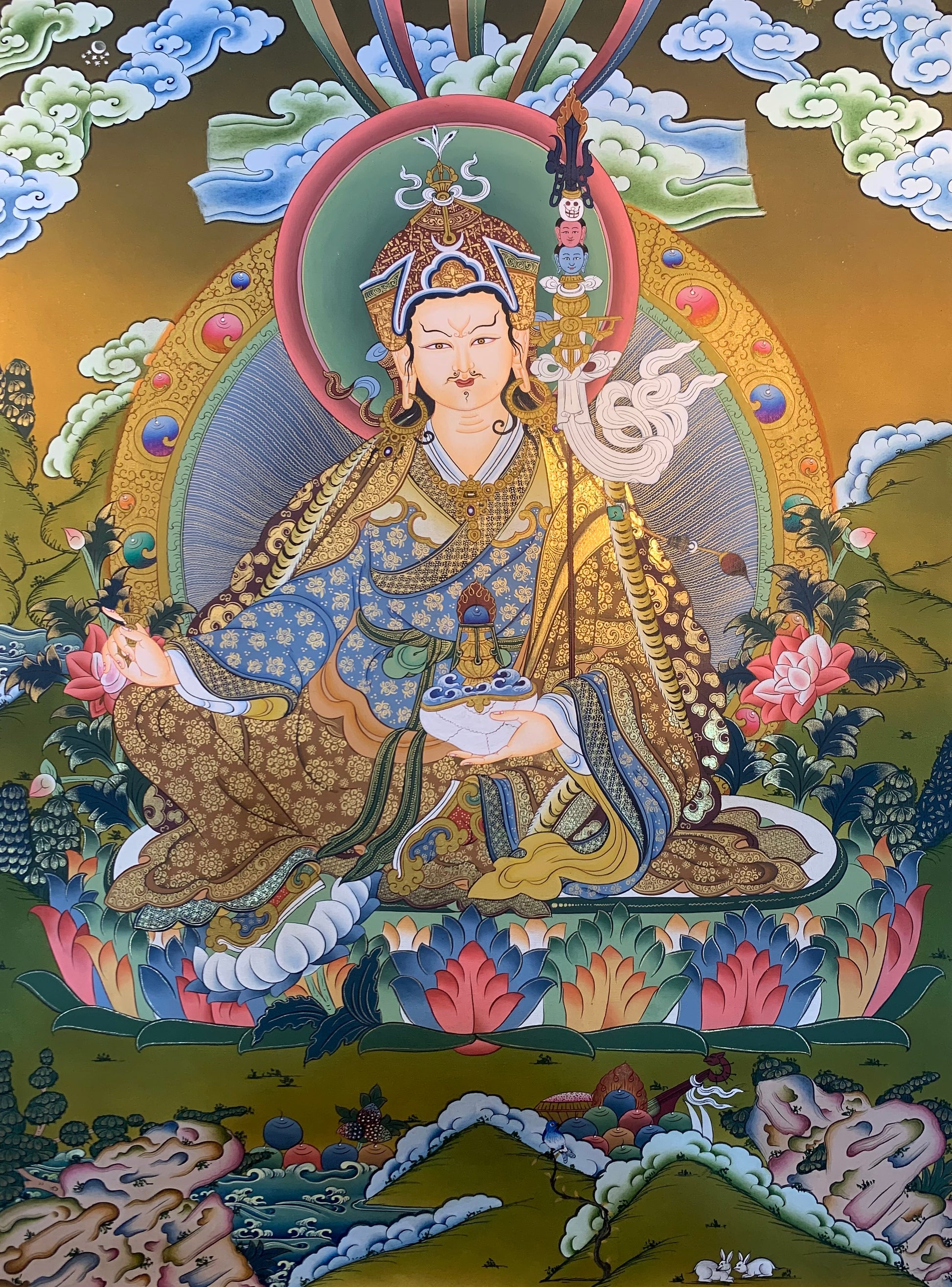 This beautiful hand painted Tibetan thangka depicts Guru Rinpoche གུ་རུ་རིན་པོ་ཆེ། (the Precious Guru), also known as Guru Padmasambhava པདྨ་འབྱུང་གནས། (Lotus born).