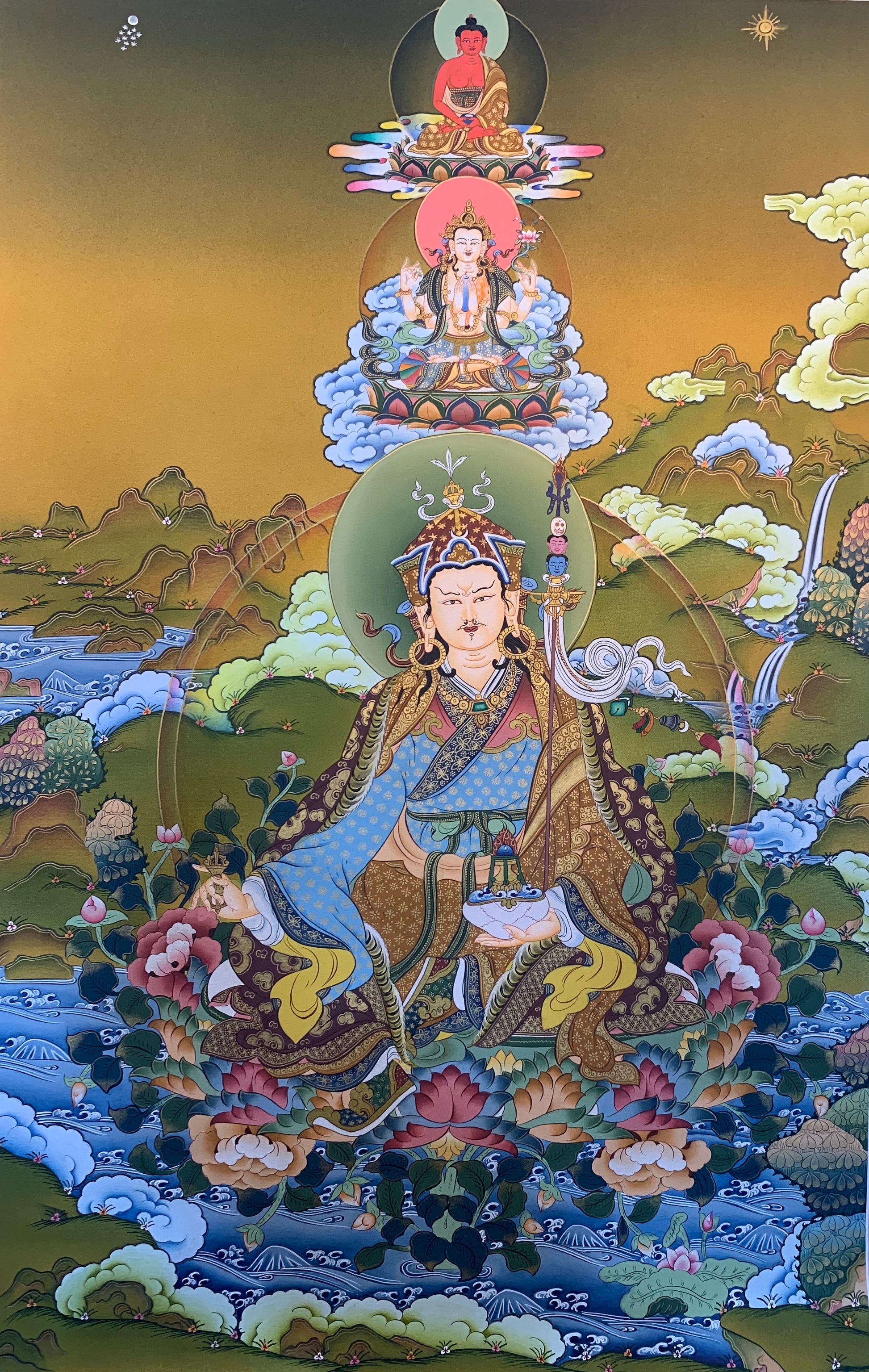 This beautiful hand painted Tibetan thangka depicts Guru Rinpoche གུ་རུ་རིན་པོ་ཆེ། (the Precious Guru), also known as Guru Padmasambhava པདྨ་འབྱུང་གནས། (Lotus born).