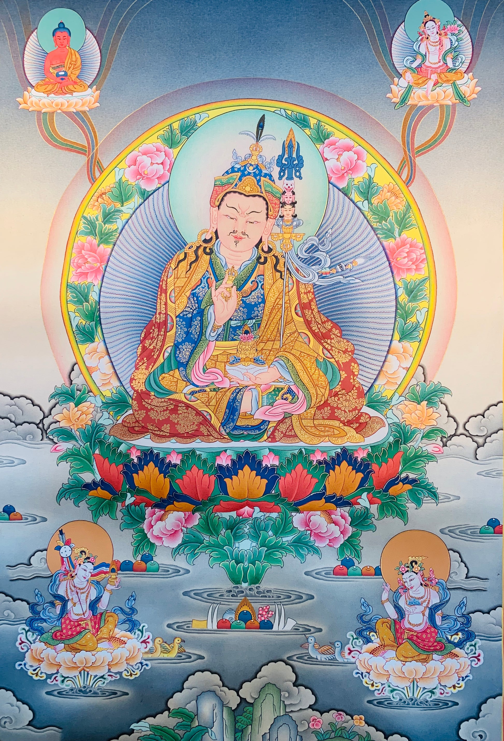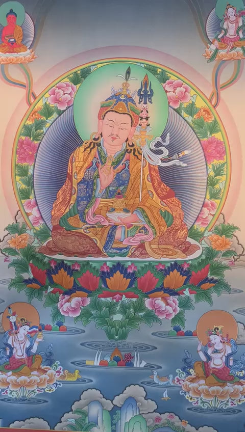 这幅美丽的手绘西藏唐卡描绘了莲花生大师གུ་རུ་རིན་པོ་ཆེ། (上师),又名莲花生大士པདྨ་འབྱུང་གནས། (莲花生)。