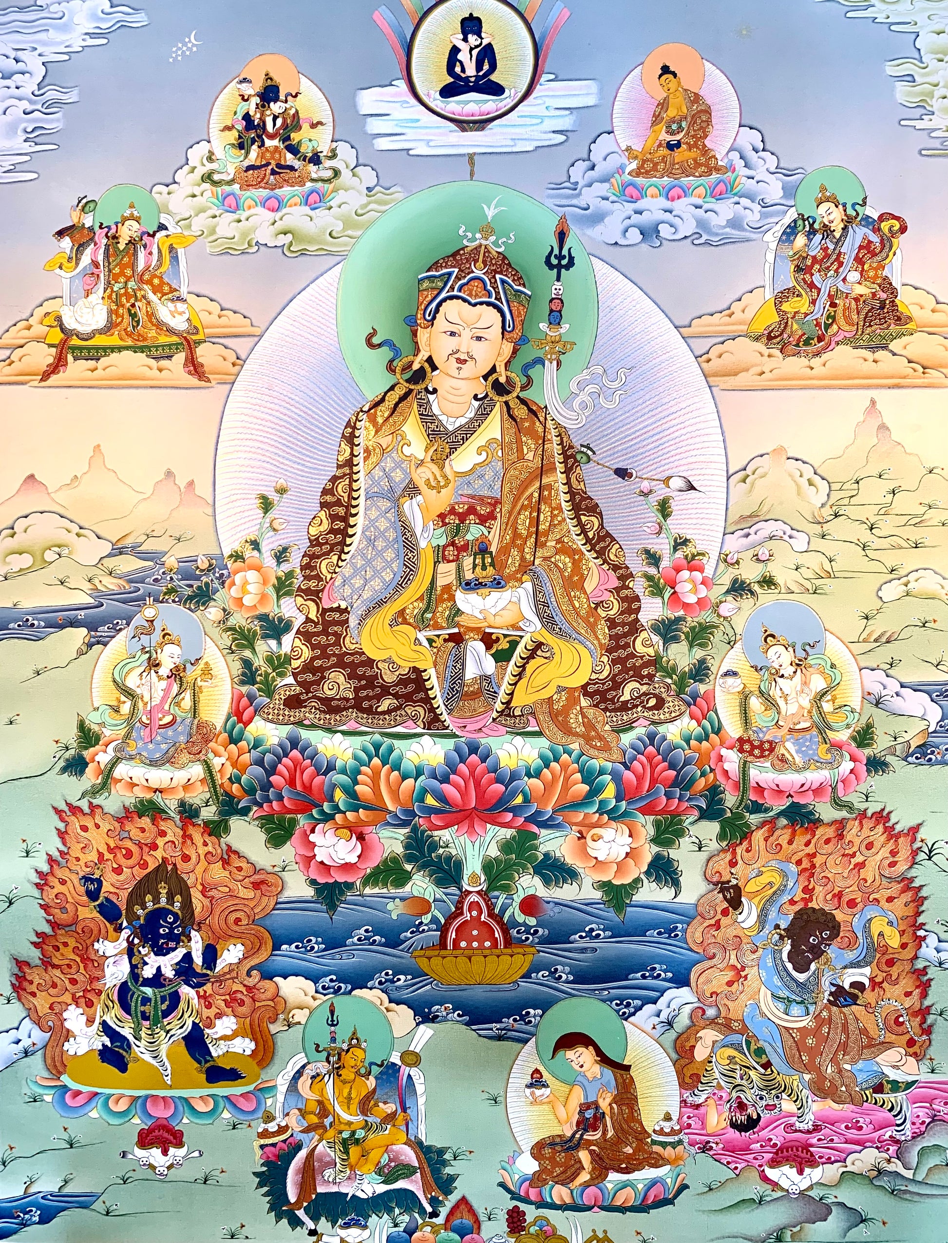 This beautiful hand painted Tibetan thangka painting depicts Guru Rinpoche གུ་རུ་རིན་པོ་ཆེ། (the Precious Guru), also known as Guru Padmasambhava པདྨ་འབྱུང་གནས། (Lotus born). Around the main image are the Eight Manifestations of Guru Rinpoche གུ་རུ་མཚན་བརྒྱད་ with his two main female disciples, Yeshe Tsogyal ཡེ་ཤེས་མཚོ་རྒྱལ་ (to his right) and Mandarava མནྡཱ་ར་བ་.