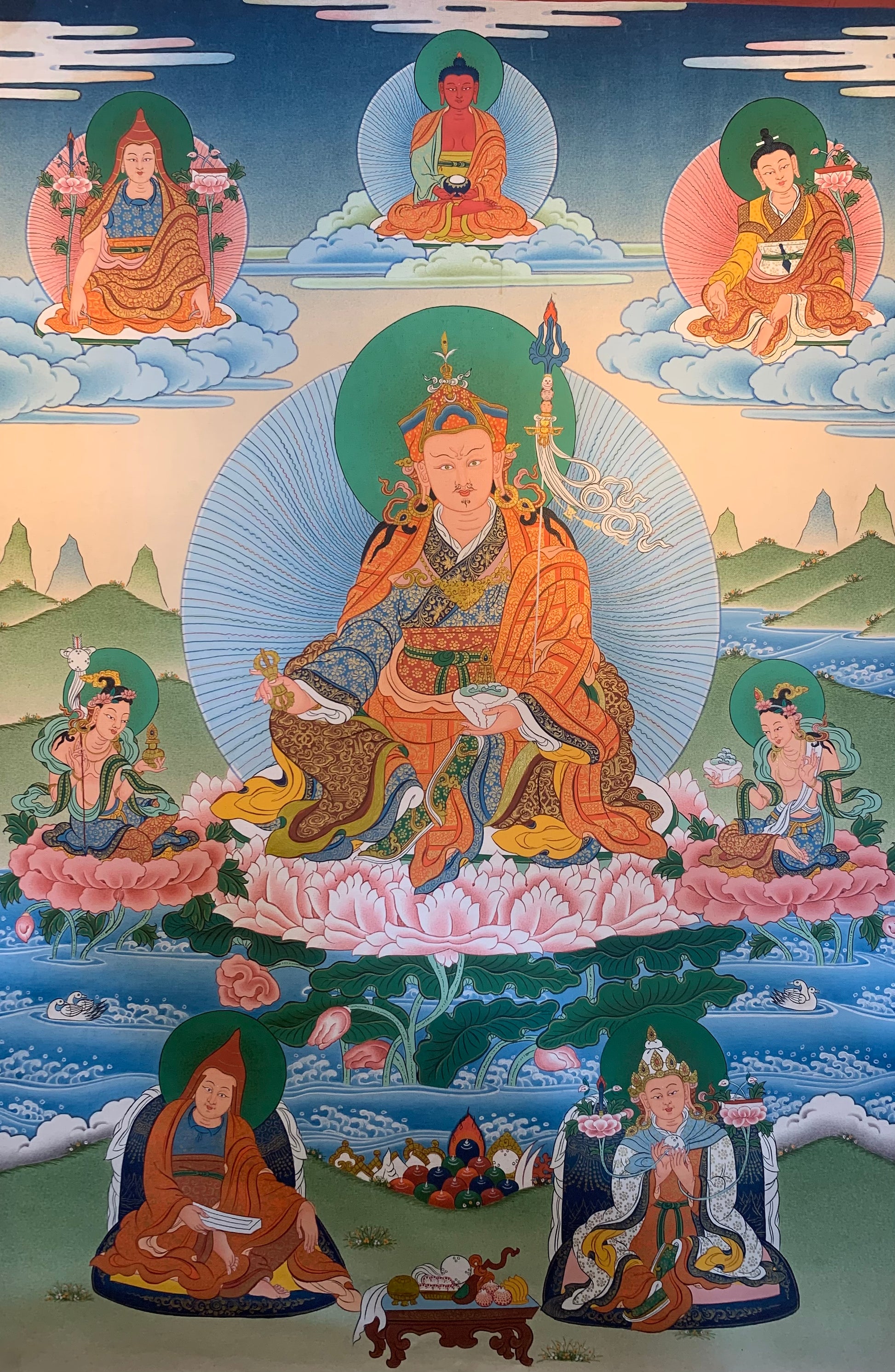 This beautiful hand painted Tibetan thangka depicts Guru Rinpoche གུ་རུ་རིན་པོ་ཆེ། (the Precious Guru), also known as Guru Padmasambhava པདྨ་འབྱུང་གནས། (Lotus born).