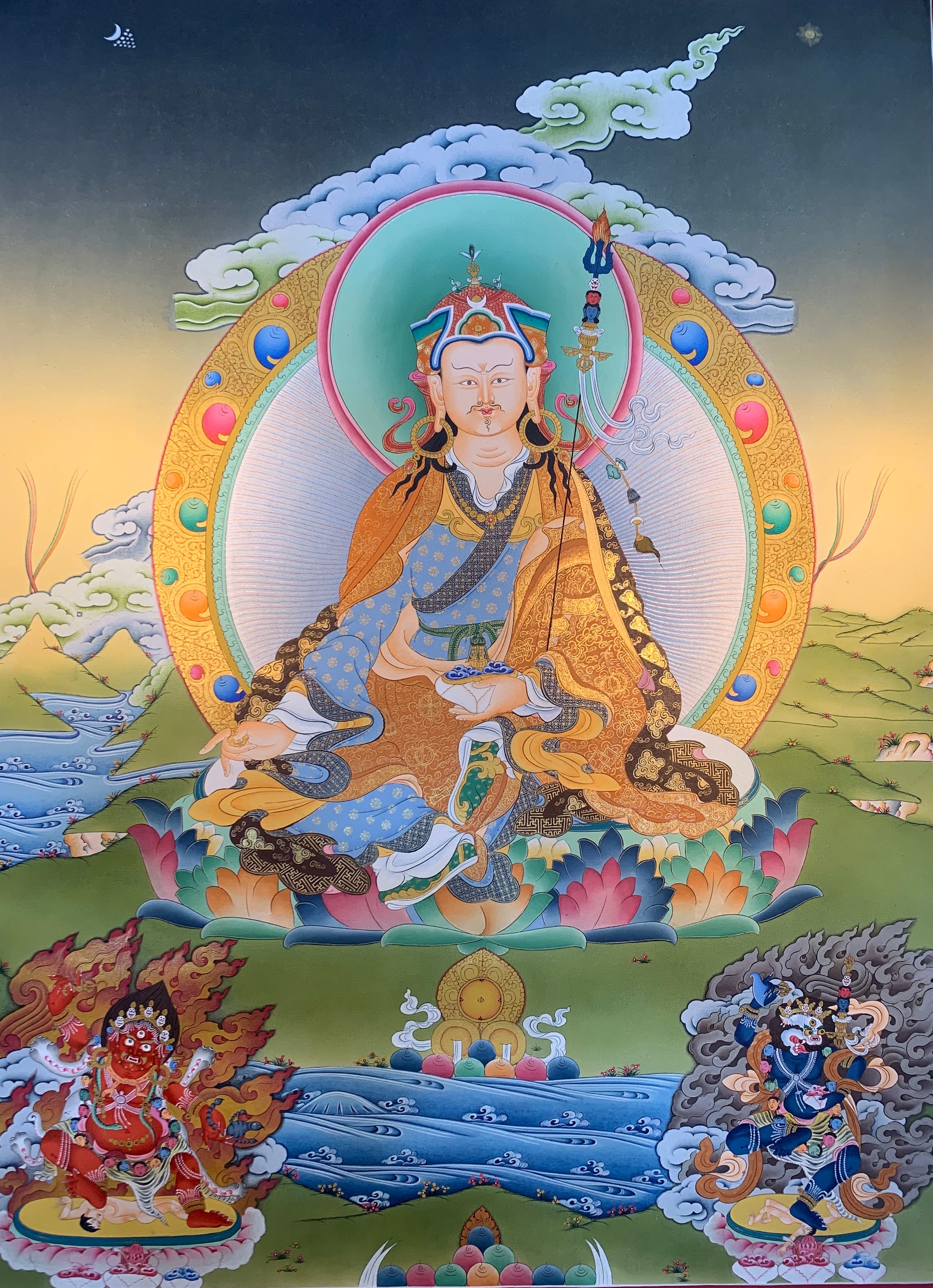 这幅美丽的手绘西藏唐卡描绘了莲花生大师གུ་རུ་རིན་པོ་ཆེ། (上师),又名莲花生大士པདྨ་འབྱུང་གནས། (莲花生)。