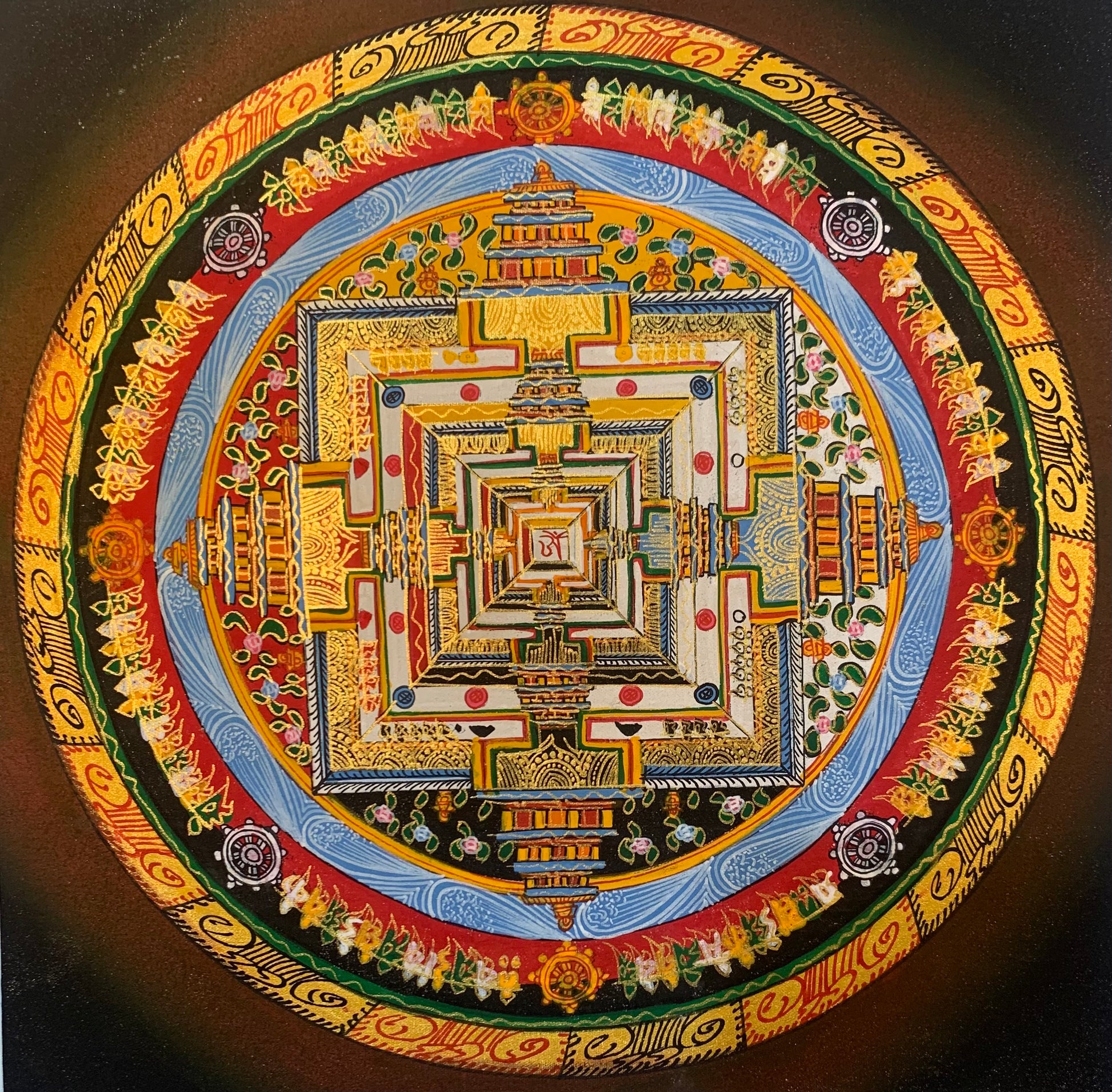 This Kalachakra Mandala Tibetan thangka painting is hand-painted by master local artists in the Kathmandu Valley, Nepal. The Buddhist Thangka depicts a beautifully detailed Kalachakra mandala design and comes unframed and ready for framing. It is painted entirely by hand on cotton canvas using natural mineral and vegetable pigments with 24K gold details. The complicated designs, intricate brushstrokes, and extraordinary detail make these thangkas authentic works of art. A true masterpiece, this painting is the perfect addition to your home, meditation space, room shrine or altar space.