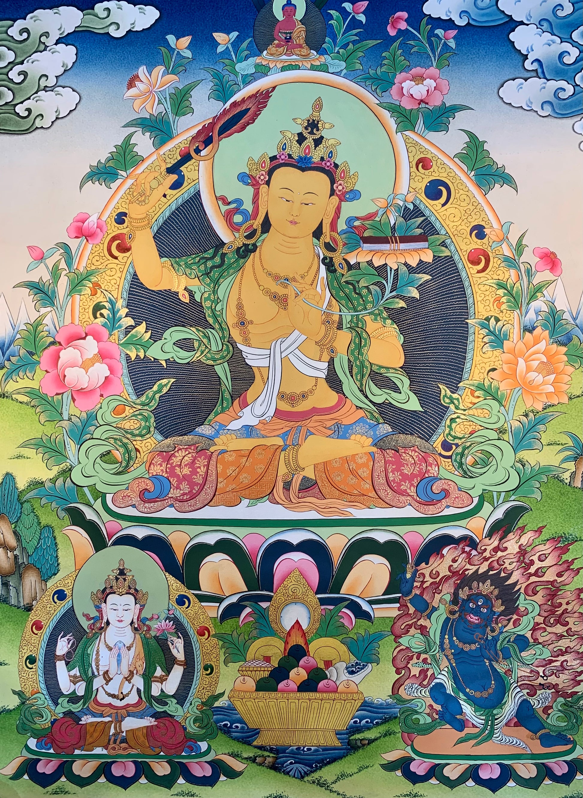 This beautiful hand-painted Tibetan thangka painting depicts Mañjushri འཇམ་དཔལ་, also known as Mañjughosha. Mañjushri is the embodiment of the knowledge and wisdom of all the Buddhas. He holds a sword that cuts all ignorance in his right hand and a Prajnaparamita sutra book in the left hand and is supported by a flower blossom.