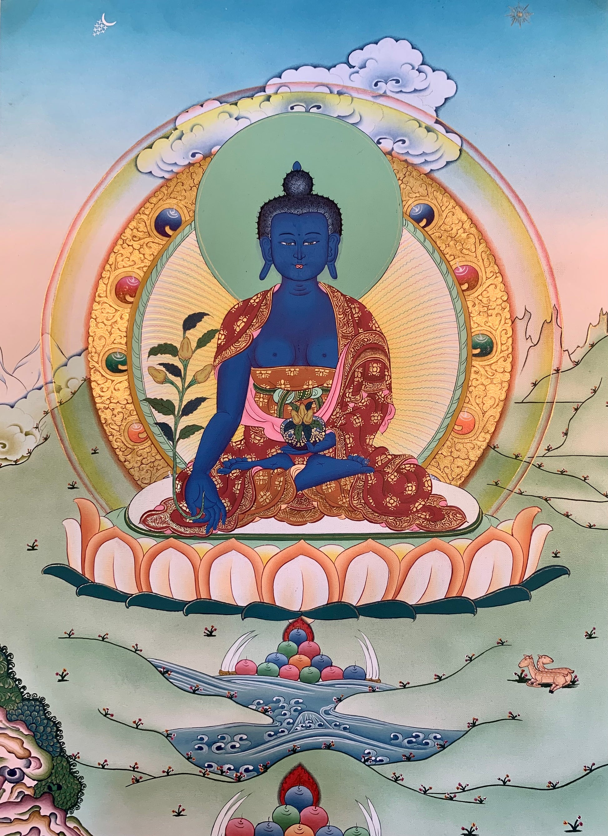 This beautiful hand painted Tibetan thangka painting depicts the Buddha of Medicine སངས་རྒྱས་སྨན་བླ་. His vow as a bodhisattva was to be able to fully free all sentient beings from their illnesses. The practices of Medicine Buddha are derived from the Bhaishajyaguru Sutra and according to Buddhist Tradition were taught by Shakyamuni Buddha.