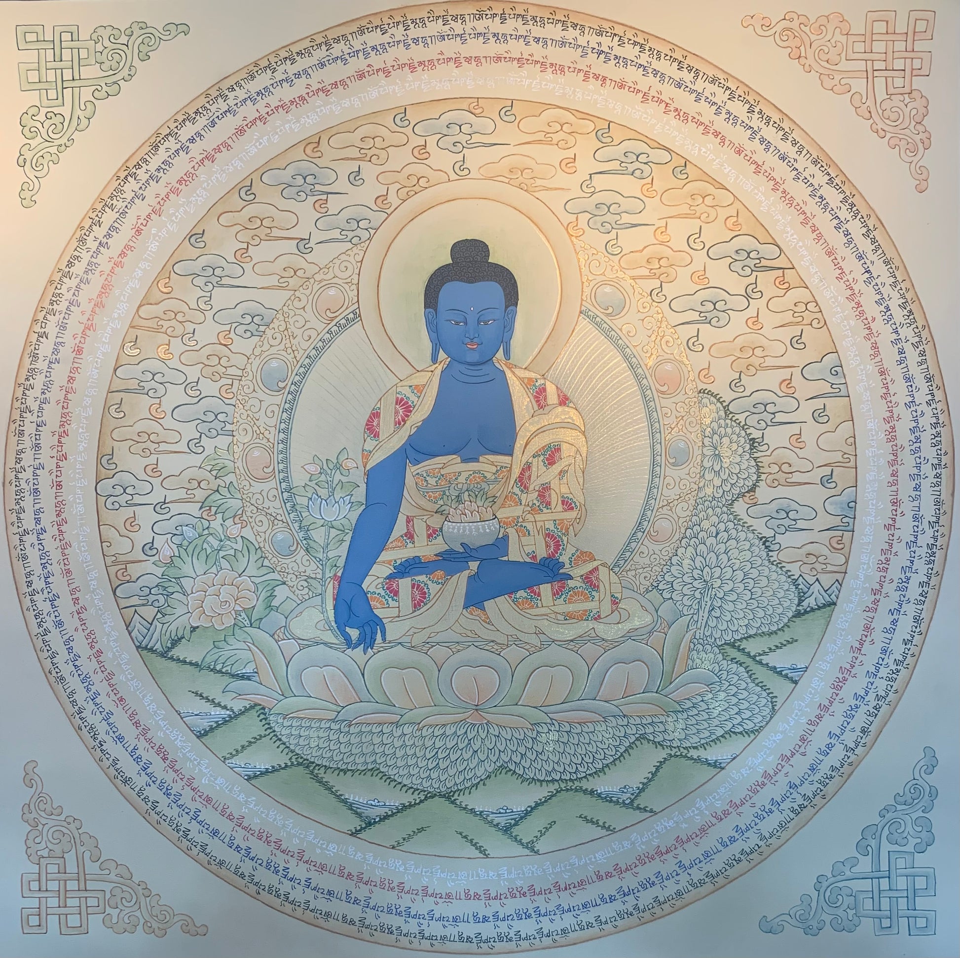 This beautiful hand painted Tibetan thangka painting depicts the Buddha of Medicine སངས་རྒྱས་སྨན་བླ་. His vow as a bodhisattva was to be able to fully free all sentient beings from their illnesses. The practices of Medicine Buddha are derived from the Bhaishajyaguru Sutra and according to Buddhist Tradition were taught by Shakyamuni Buddha.