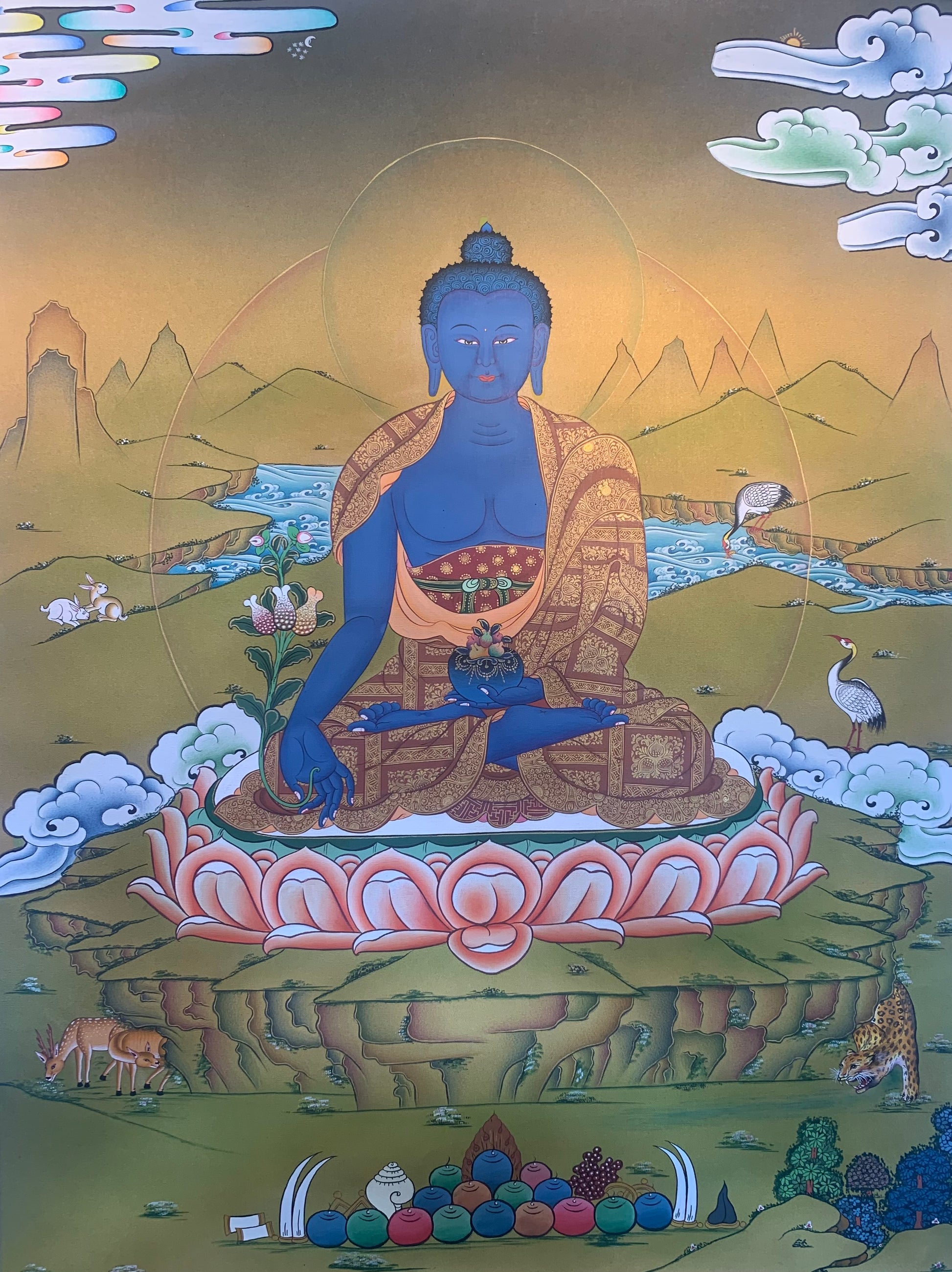 This beautiful hand painted Tibetan thangka painting depicts the Buddha of Medicine སངས་རྒྱས་སྨན་བླ་. His vow as a bodhisattva was to be able to fully free all sentient beings from their illnesses. The practices of Medicine Buddha are derived from the Bhaishajyaguru Sutra and according to Buddhist Tradition were taught by Shakyamuni Buddha.