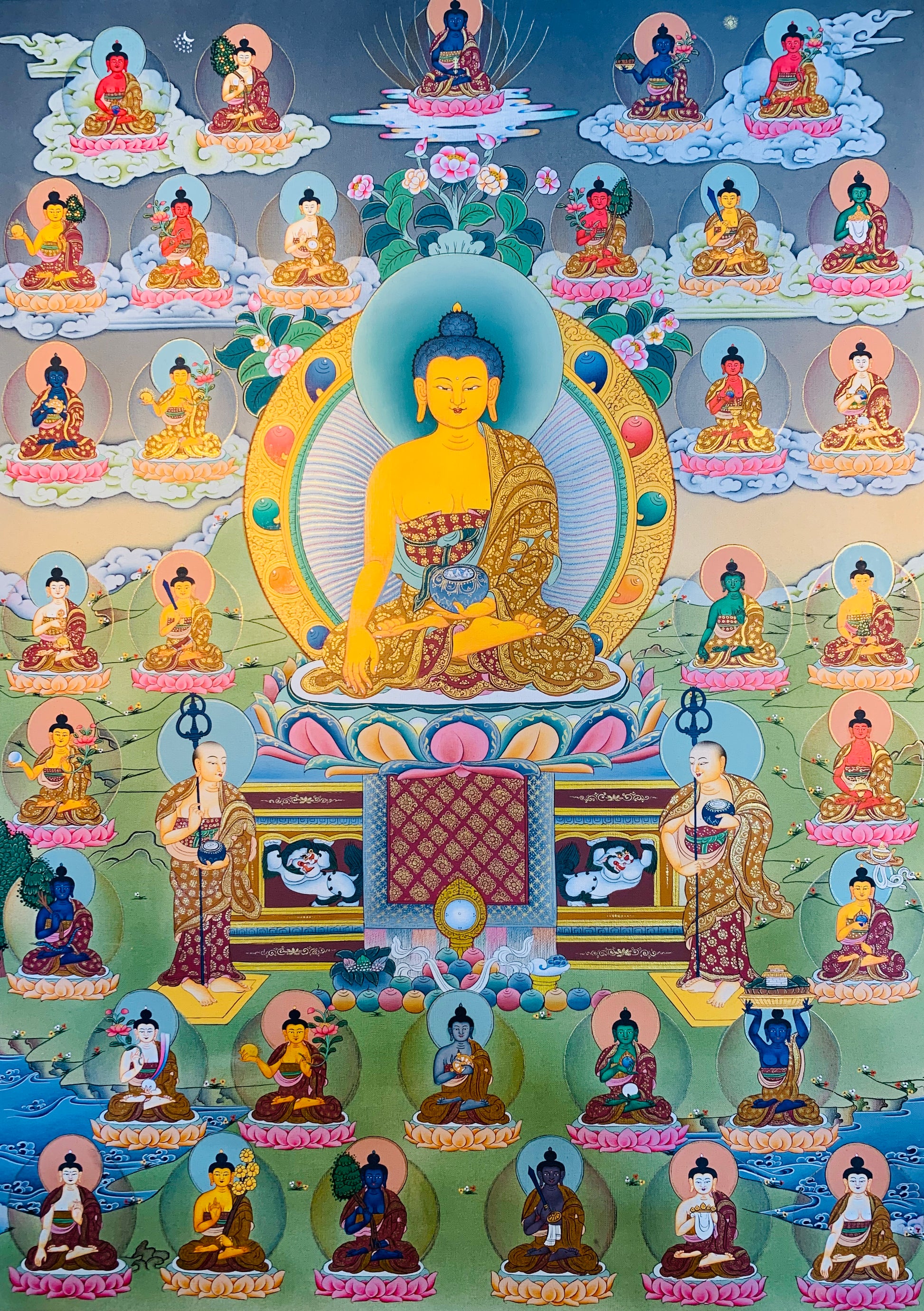 This beautiful hand painted Tibetan thangka depicts Shakyamuni Buddha སངས་རྒྱས་ཤཱཀྱ་ཐུབ་པ། (aka Gautama Buddha) sitting on a lotus platform upon a Lion Throne. The Buddha is seated with his right hand in earth-touching bhumisparsa mudra and with an alms bowl filled with nectar in his left hand. Together with buddha Shakyamuni are the Thirty-five Buddhas of confession གཤེག་ལྷ་སོ་ལྔ་ from the Sutra of the Three Heaps ཕུང་པོ་གསུམ་པའི་མདོ་. Reciting this sutra is considered a method of purifying broken vows and downfalls of the bodhisattva vow by invoking thirty-five Buddhas of confession.