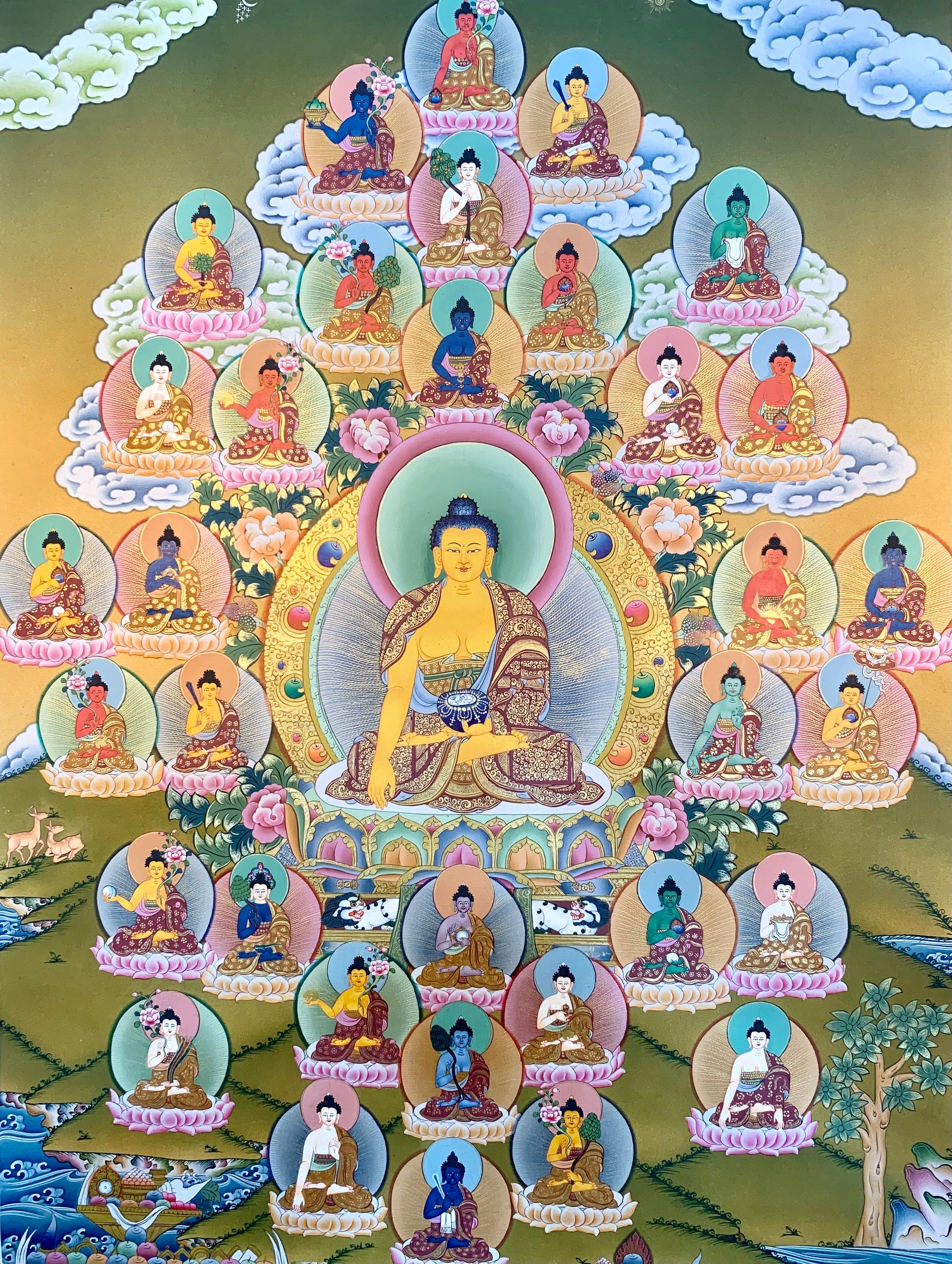 This beautiful hand painted Tibetan thangka depicts Shakyamuni Buddha སངས་རྒྱས་ཤཱཀྱ་ཐུབ་པ། (aka Gautama Buddha) sitting on a lotus platform upon a Lion Throne. The Buddha is seated with his right hand in earth-touching bhumisparsa mudra and with an alms bowl filled with nectar in his left hand. Together with buddha Shakyamuni are the Thirty-five Buddhas of confession གཤེག་ལྷ་སོ་ལྔ་ from the Sutra of the Three Heaps ཕུང་པོ་གསུམ་པའི་མདོ་. Reciting this sutra is considered a method of purifying broken vows and downfalls of the bodhisattva vow by invoking thirty-five Buddhas of confession.