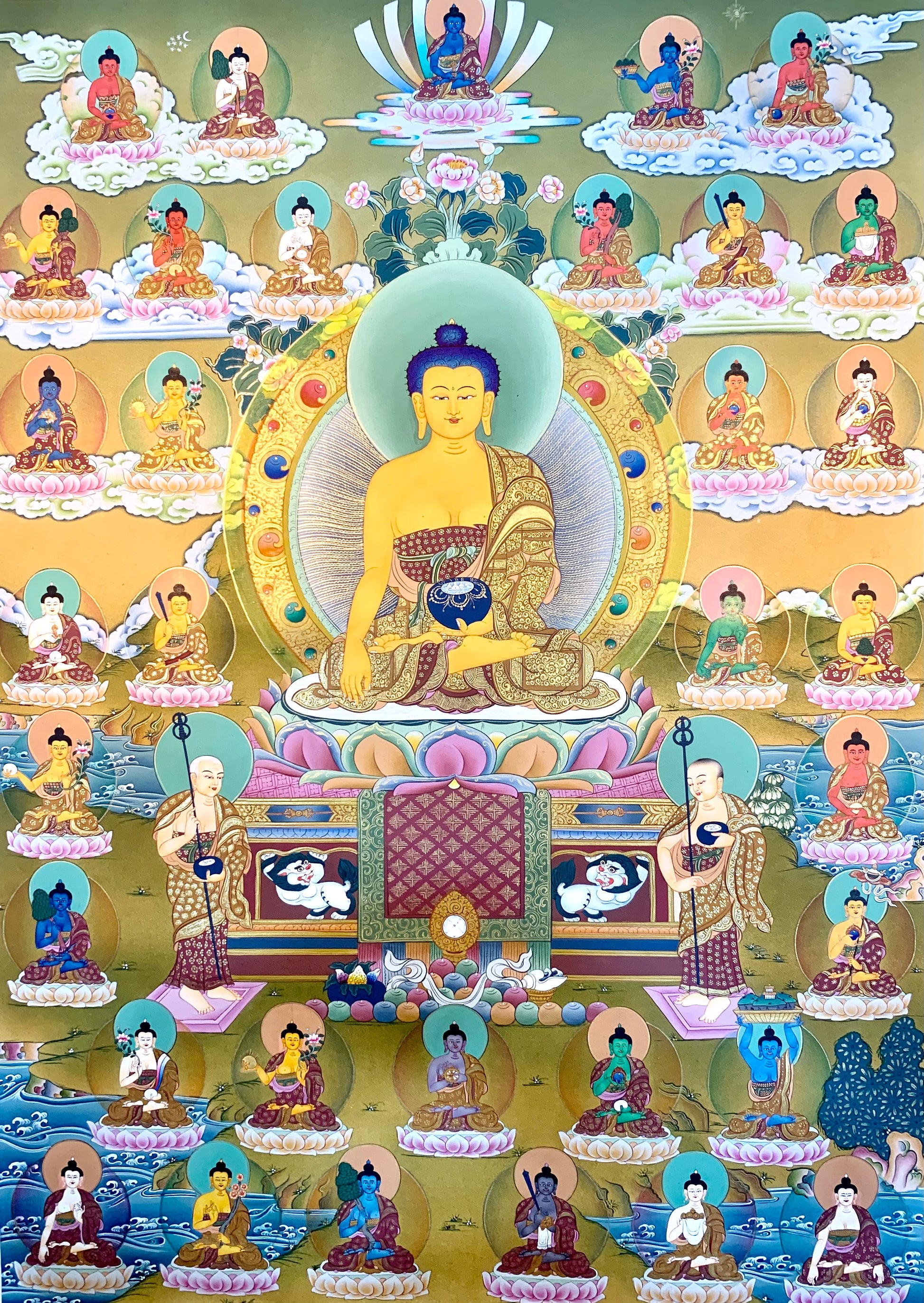 This beautiful hand painted Tibetan thangka depicts Shakyamuni Buddha སངས་རྒྱས་ཤཱཀྱ་ཐུབ་པ། (aka Gautama Buddha) sitting on a lotus platform upon a Lion Throne. The Buddha is seated with his right hand in earth-touching bhumisparsa mudra and with an alms bowl filled with nectar in his left hand. Together with buddha Shakyamuni are the Thirty-five Buddhas of confession གཤེག་ལྷ་སོ་ལྔ་ from the Sutra of the Three Heaps ཕུང་པོ་གསུམ་པའི་མདོ་. Reciting this sutra is considered a method of purifying broken vows and downfalls of the bodhisattva vow by invoking thirty-five Buddhas of confession.