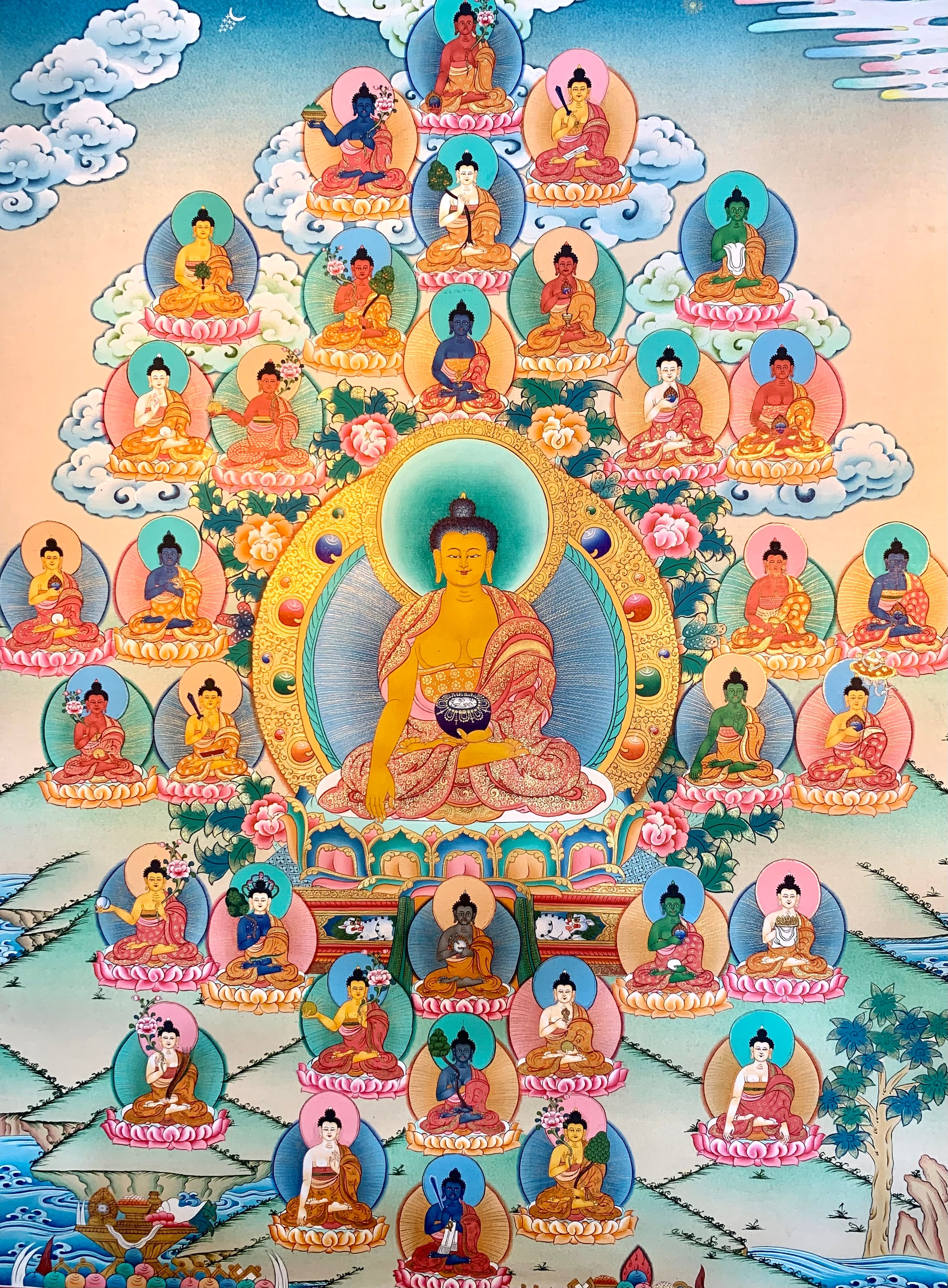 This beautiful hand painted Tibetan thangka depicts Shakyamuni Buddha སངས་རྒྱས་ཤཱཀྱ་ཐུབ་པ། (aka Gautama Buddha) sitting on a lotus platform upon a Lion Throne. The Buddha is seated with his right hand in earth-touching bhumisparsa mudra and with an alms bowl filled with nectar in his left hand. Together with buddha Shakyamuni are the Thirty-five Buddhas of confession གཤེག་ལྷ་སོ་ལྔ་ from the Sutra of the Three Heaps ཕུང་པོ་གསུམ་པའི་མདོ་. Reciting this sutra is considered a method of purifying broken vows and downfalls of the bodhisattva vow by invoking thirty-five Buddhas of confession.