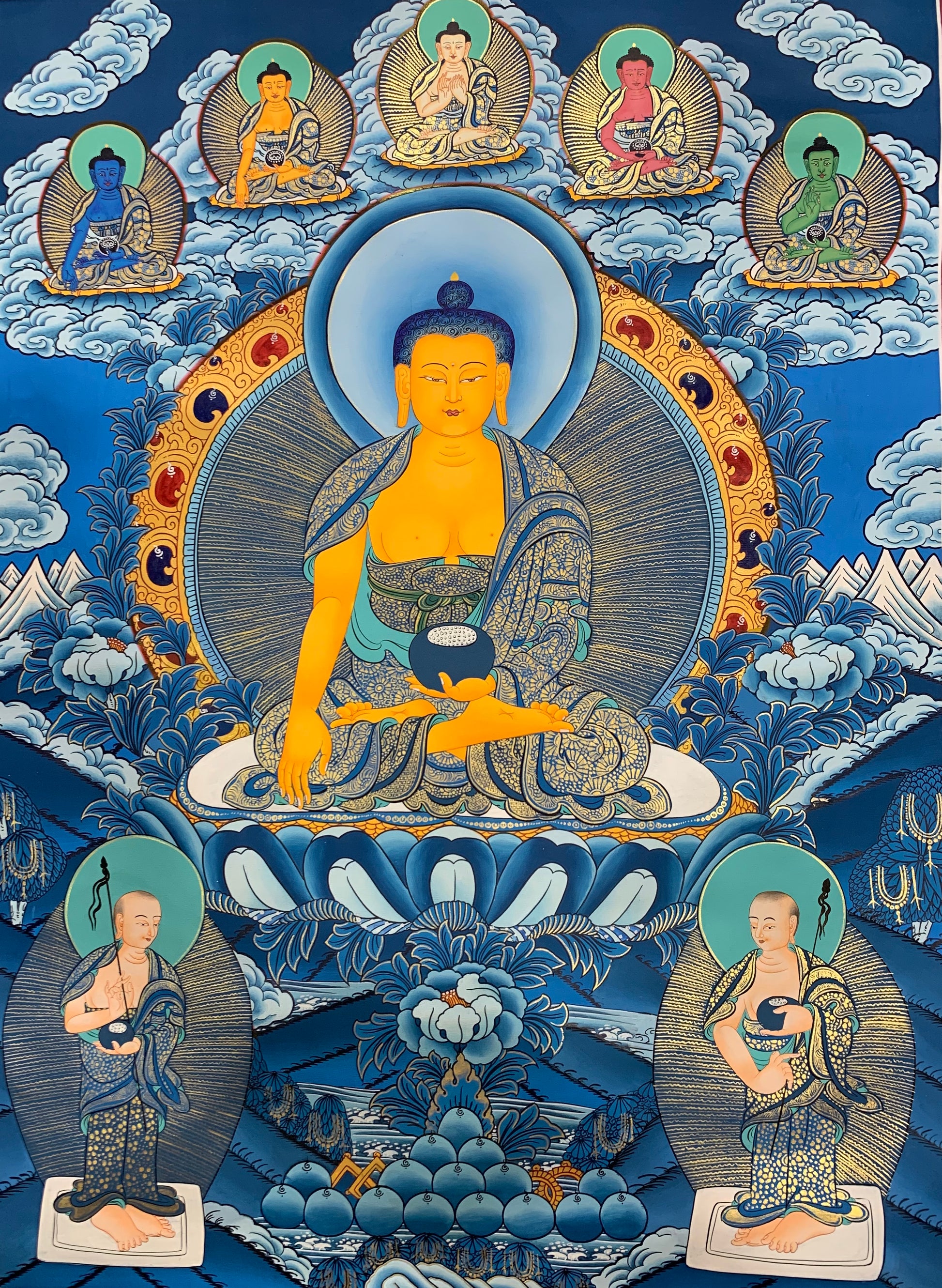 这幅美丽的手绘西藏唐卡描绘了释迦牟尼佛 སངས་རྒྱས་ཤཱཀྱ་ཐུབ་པ། (又名释迦牟尼佛) 坐在狮子宝座上的莲花平台上。佛陀用右手坐在地上 布密斯帕萨 手印 左手有一个装满花蜜的施舍碗。他的两个主要门徒,萨里普特拉 ཤཱ་རིའི་བུ། 和 Maudgalyayana མོའུ་འགལ་གྱི་བུ།,站在他的两侧,每个人都握 卡哈拉 员工在右手,左边有一个黑色施舍碗。以上 唐卡上部的释迦牟尼佛是五个家庭的佛像(金纳库拉)-Vairochanaརྣམ་པར་སྣང་མཛད་(白色),Akshobhyaམི་བསྐྱོད་པ་(蓝色),Ratnasambhavaརིན་ཆེན་འབྱུང་གནས་(金色/黄色),Amitabhaའོད་དཔག་མེད་(红色)和Amoghasiddhi(绿色)。