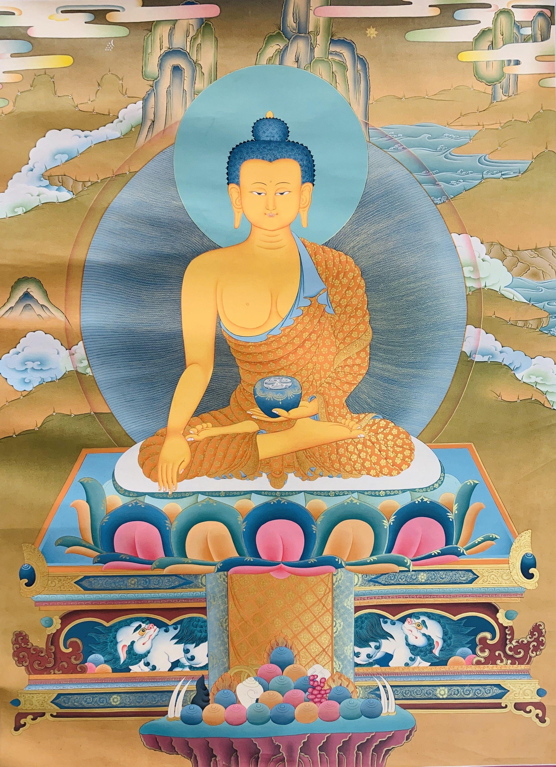 这幅美丽的手绘西藏唐卡描绘了释迦牟尼佛 སངས་རྒྱས་ཤཱཀྱ་ཐུབ་པ། (又名释迦牟尼佛) 坐在狮子宝座上的莲花平台上。佛陀用右手坐在地上 布密斯帕萨 手印 左手有一个装满花蜜的施舍碗。