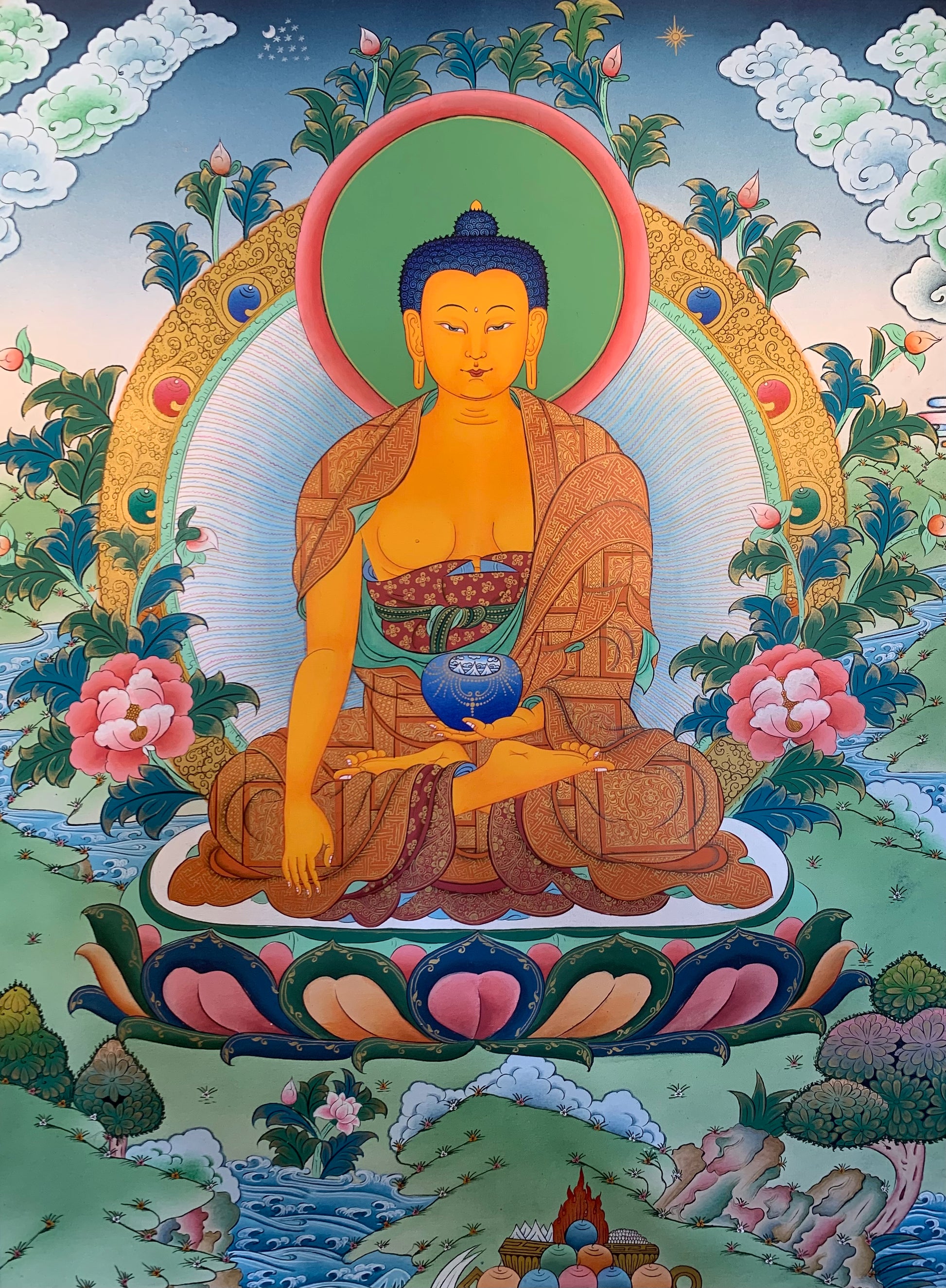 This beautiful hand painted Tibetan thangka depicts Shakyamuni Buddha སངས་རྒྱས་ཤཱཀྱ་ཐུབ་པ (aka Gautama Buddhasitting on a lotus platform upon a Lion Throne. The Buddha is seated with his right hand in earth-touching bhumisparsa mudra and with an alms bowl filled with nectar in his left hand.