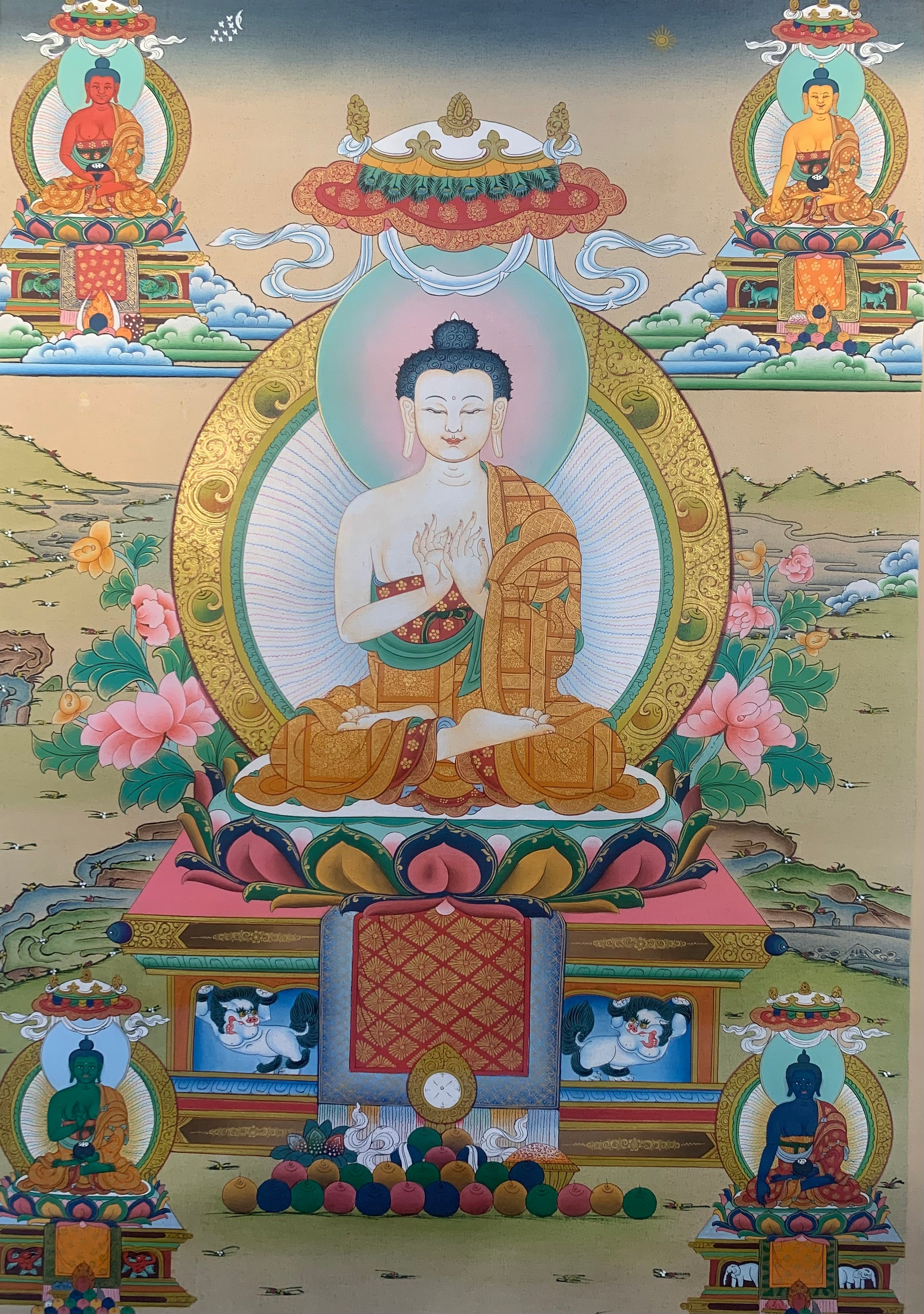 This beautiful hand painted Tibetan thangka depicts Shakyamuni Buddha སངས་རྒྱས་ཤཱཀྱ་ཐུབ་པ། (aka Gautama Buddha) sitting on a lotus platform upon a Lion Throne. The Buddha is seated with his right hand in earth-touching bhumisparsa mudra and with an alms bowl filled with nectar in his left hand.