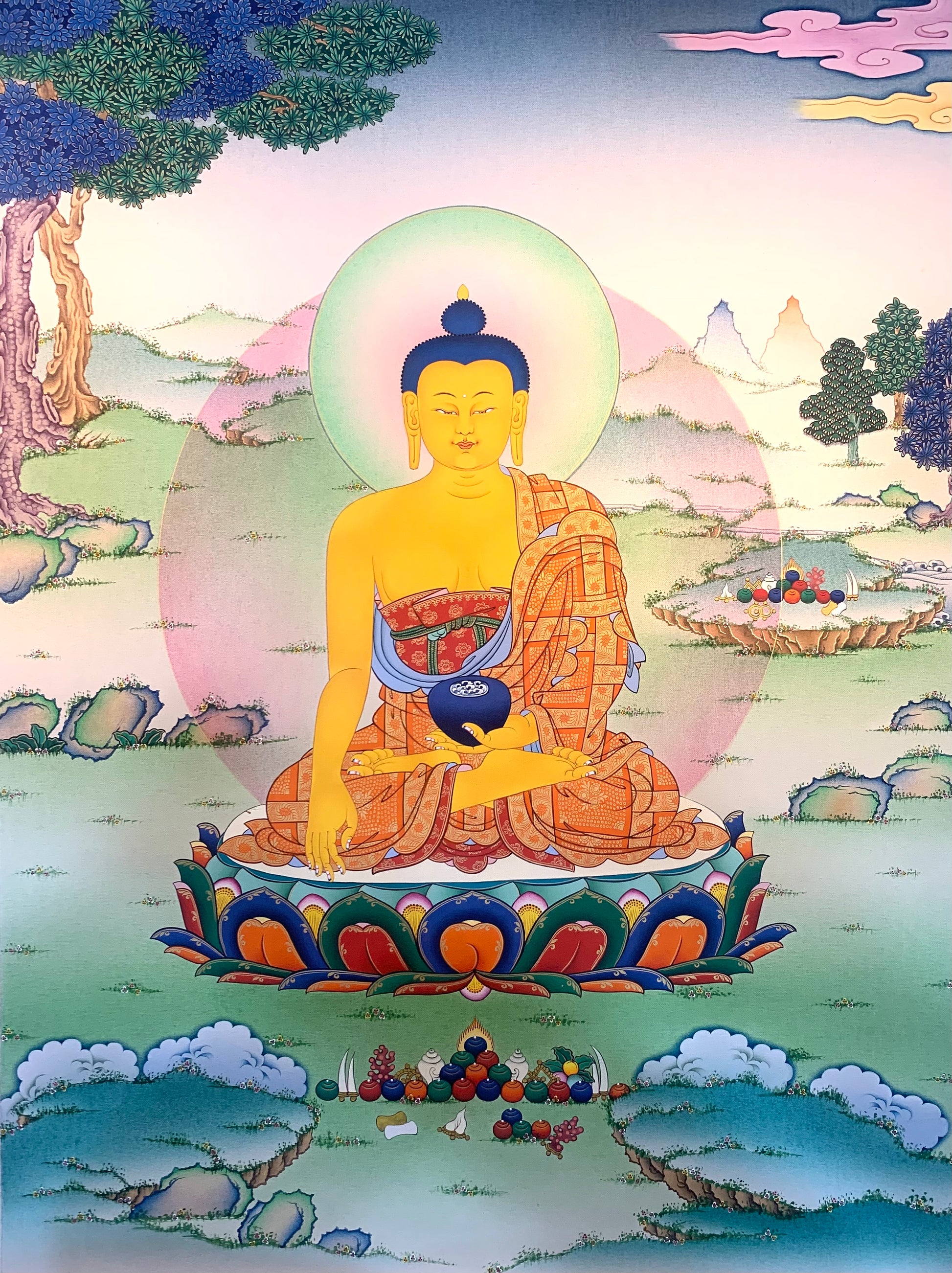 This beautiful hand painted Tibetan thangka depicts Shakyamuni Buddha སངས་རྒྱས་ཤཱཀྱ་ཐུབ་པ། (aka Gautama Buddha) sitting on a lotus platform. The Buddha is seated with his right hand in earth-touching bhumisparsa mudra and with an alms bowl filled with nectar in his left hand. His two principal disciples, Sariputra ཤཱ་རིའི་བུ། and Maudgalyayana མོའུ་འགལ་གྱི་བུ།, stand to his sides and each holds a khakkhara staff in the right hand and a black alms bowl in the left.