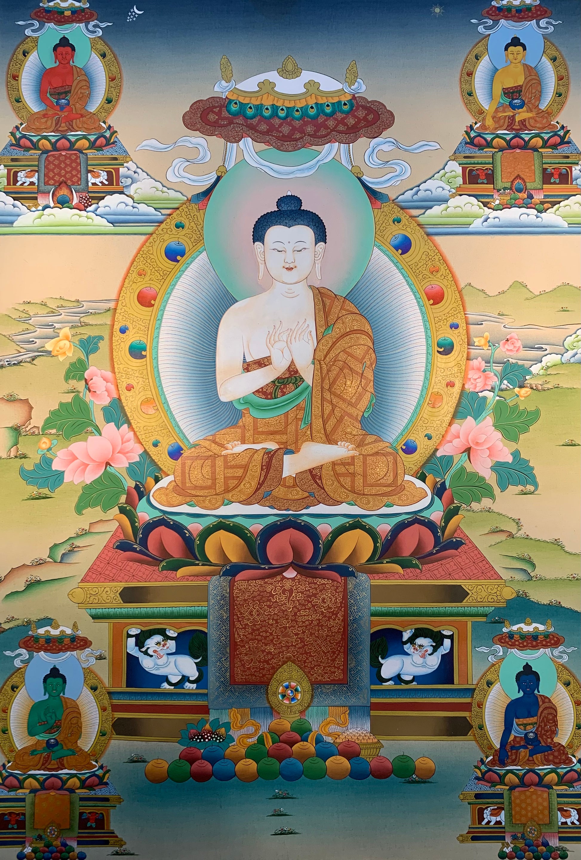 This beautiful hand painted Tibetan thangka depicts Shakyamuni Buddha སངས་རྒྱས་ཤཱཀྱ་ཐུབ་པ། (aka Gautama Buddha) sitting on a lotus platform upon a Lion Throne. The Buddha is seated with his right hand in earth-touching bhumisparsa mudra and with an alms bowl filled with nectar in his left hand.