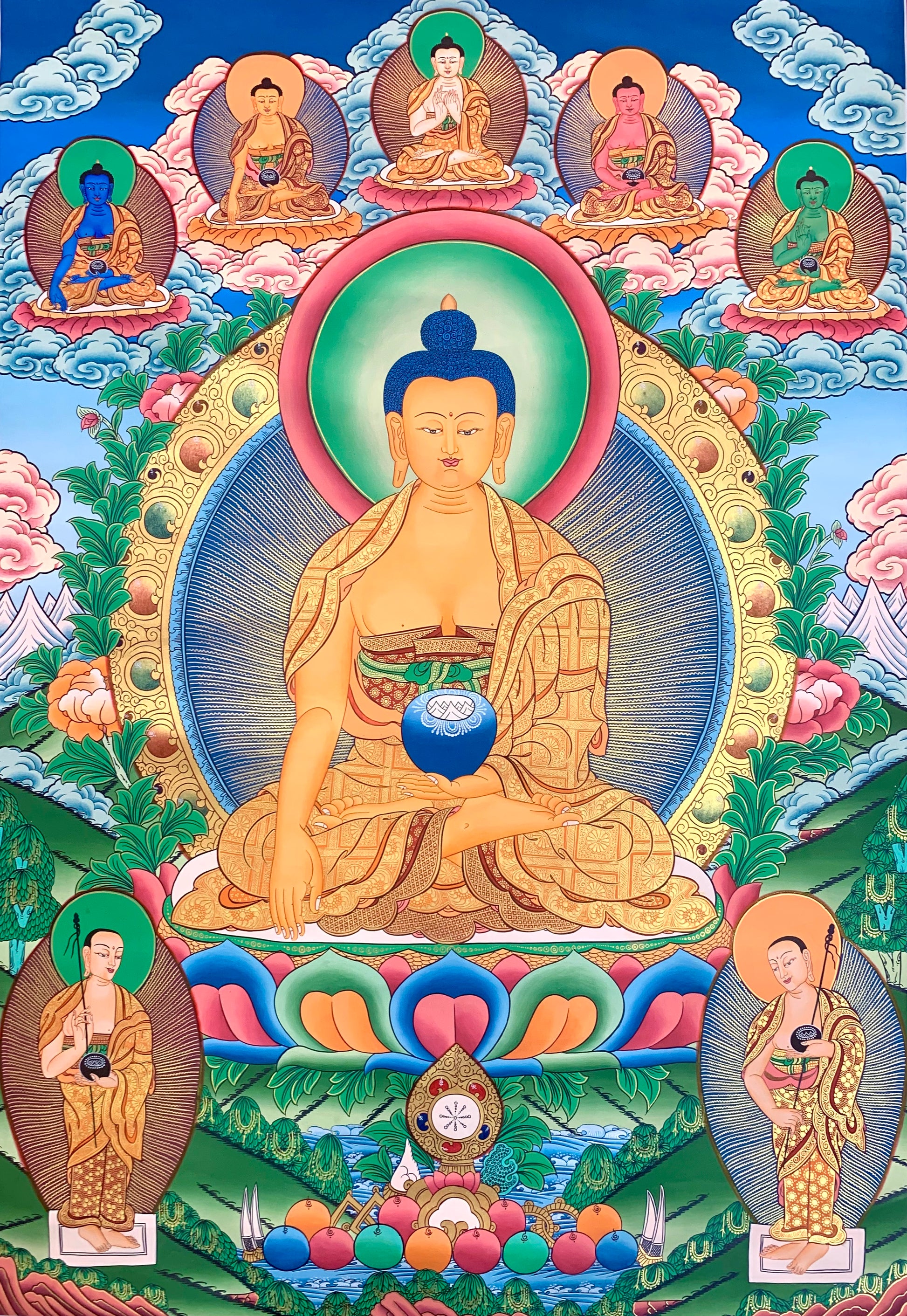 This beautiful hand painted Tibetan thangka depicts Shakyamuni Buddha སངས་རྒྱས་ཤཱཀྱ་ཐུབ་པ། (aka Gautama Buddha) sitting on a lotus platform upon a Lion Throne. The Buddha is seated with his right hand in earth-touching bhumisparsa mudra and with an alms bowl filled with nectar in his left hand.