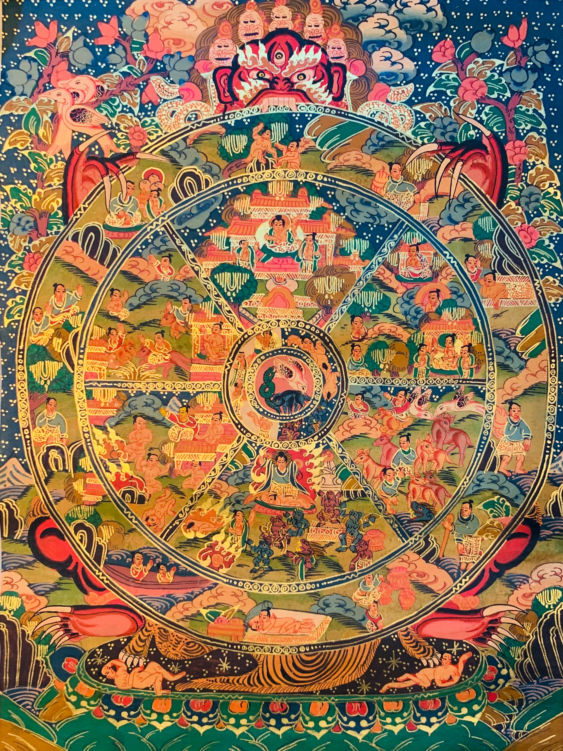 这张精美的手绘西藏唐卡画描绘了生命之轮སྲིད་པའི་འཁོར་ལོ་(bhavacakra),也被称为存在之轮或``摩天轮'' E存在。
