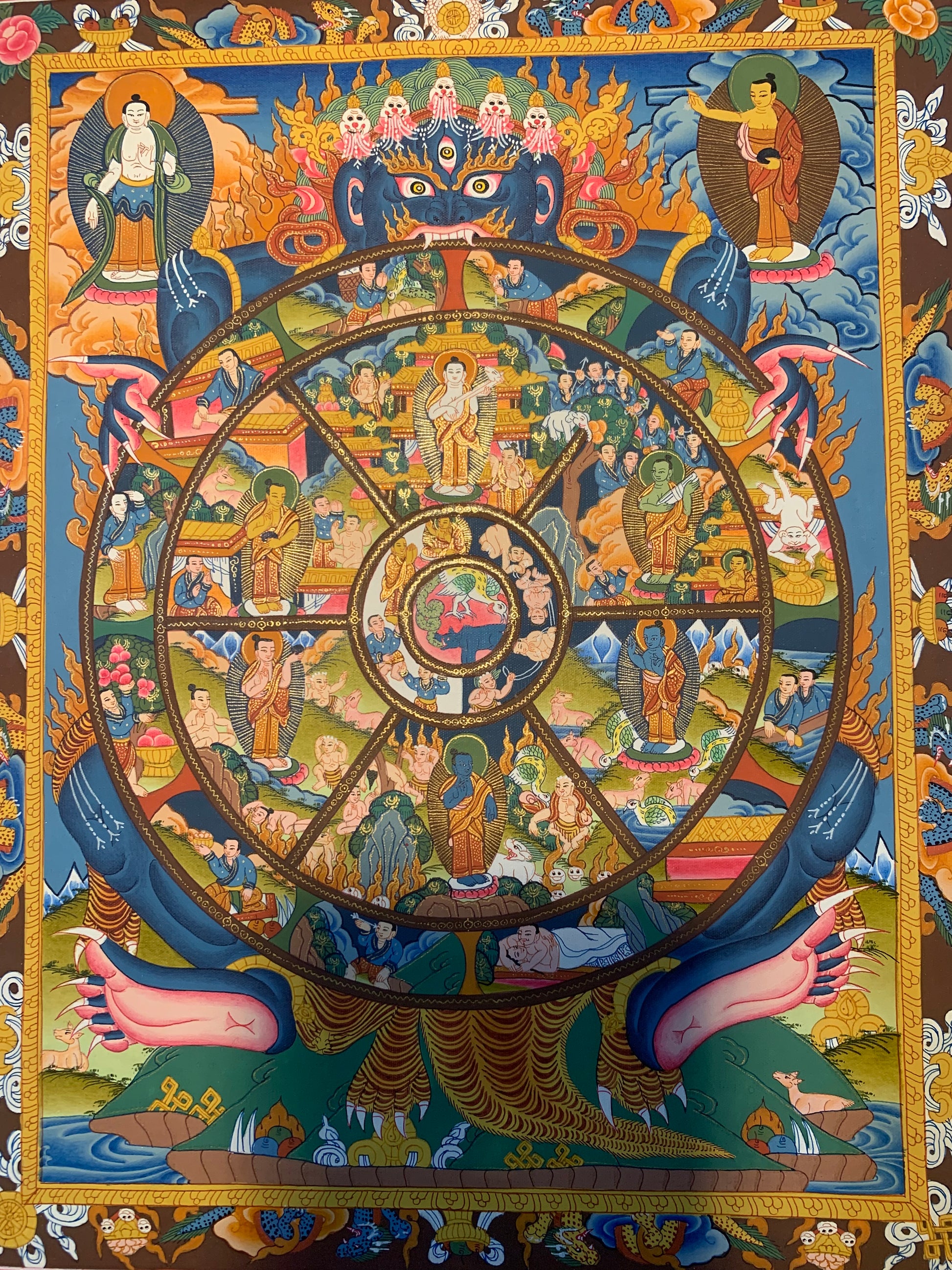 This beautiful hand painted Tibetan thangka painting depicts The Wheel of Life སྲིད་པའི་འཁོར་ལོ་ (bhavacakra), also known as Wheel of Existence, or Wheel of Cyclic Existence.