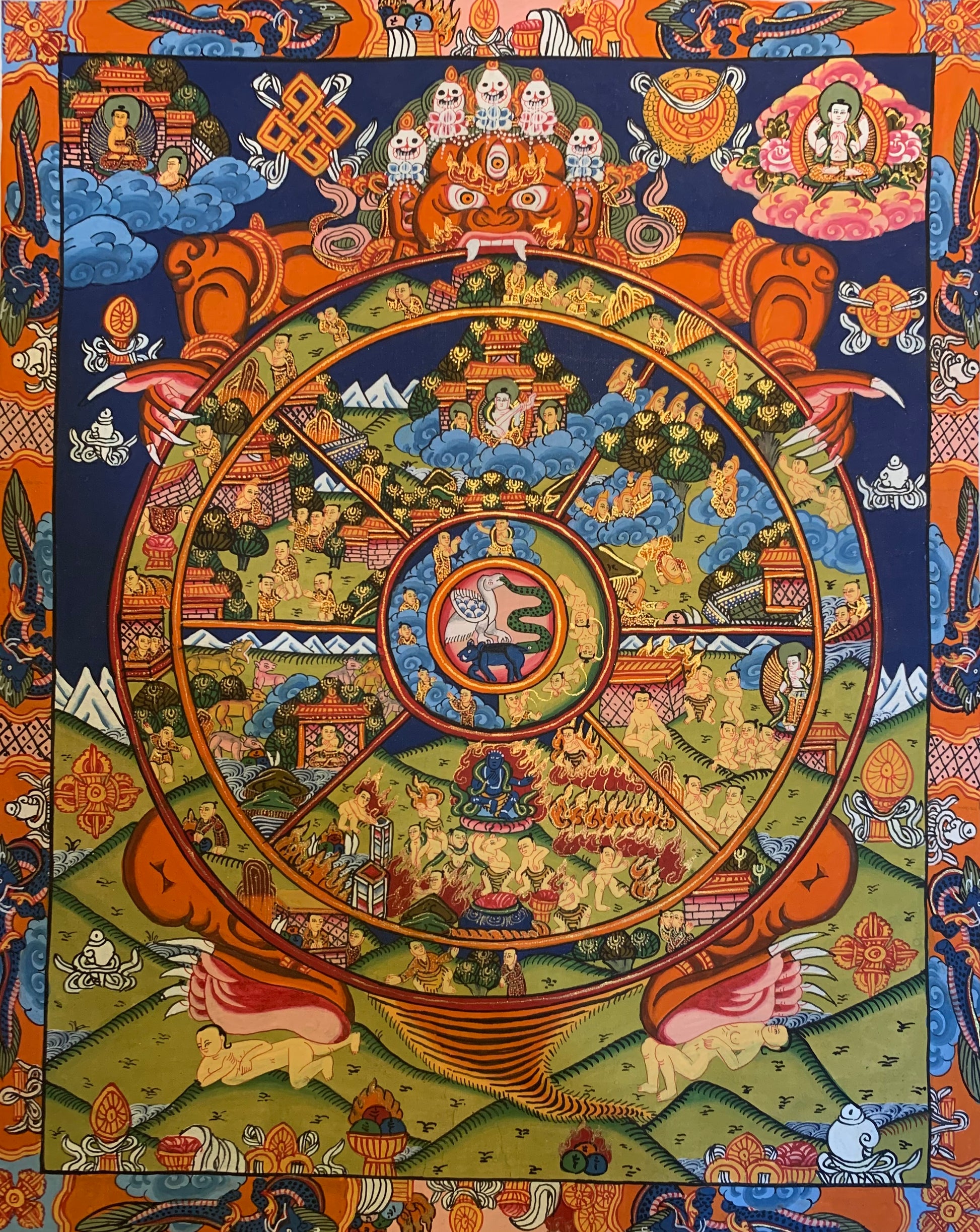 This beautiful hand painted Tibetan thangka painting depicts The Wheel of Life སྲིད་པའི་འཁོར་ལོ་ (bhavacakra), also known as Wheel of Existence, or Wheel of Cyclic Existence.