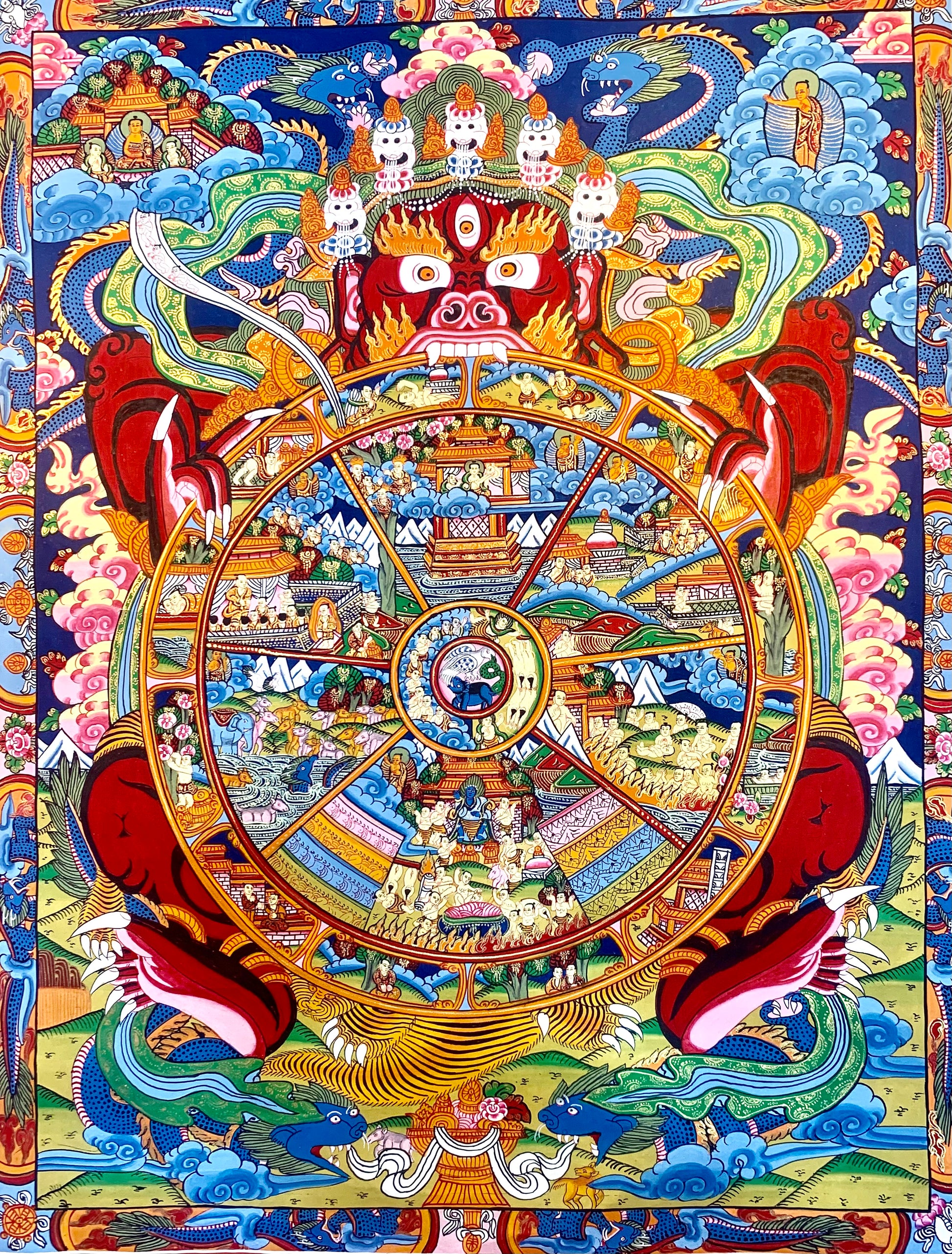 这张精美的手绘西藏唐卡画描绘了生命之轮སྲིད་པའི་འཁོར་ལོ་(bhavacakra),也被称为存在之轮或``摩天轮'' E存在。