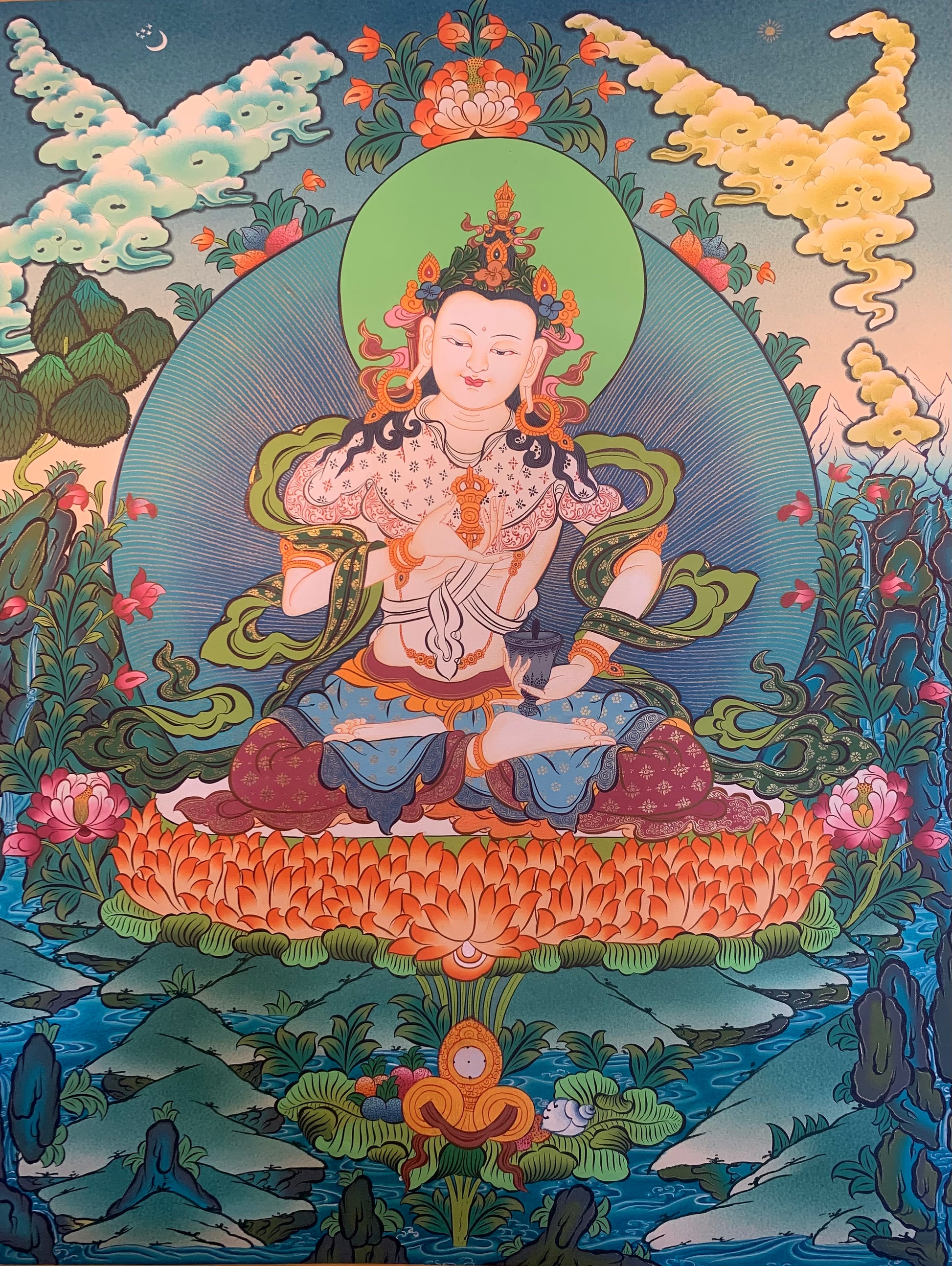 Vajrasattva is white in color, symbolising his impeccable purity. He holds a vajra in his right hand, a weapon used as a ritual object, that symbolises the properties of a diamond (indestructibility), and a thunderbolt (irresistible force). In his left hand he holds a Ghanta, a bell of wisdom. The sound of the bell is thought to call to mind the empty nature of all things, helping us to become free of attachment and aversion, liberated from the painful cycle of birth and death. He is depicted in full lotus, or vajra, position. He wears the exquisite silk robes and jewelled ornaments of ancient Indian royalty.