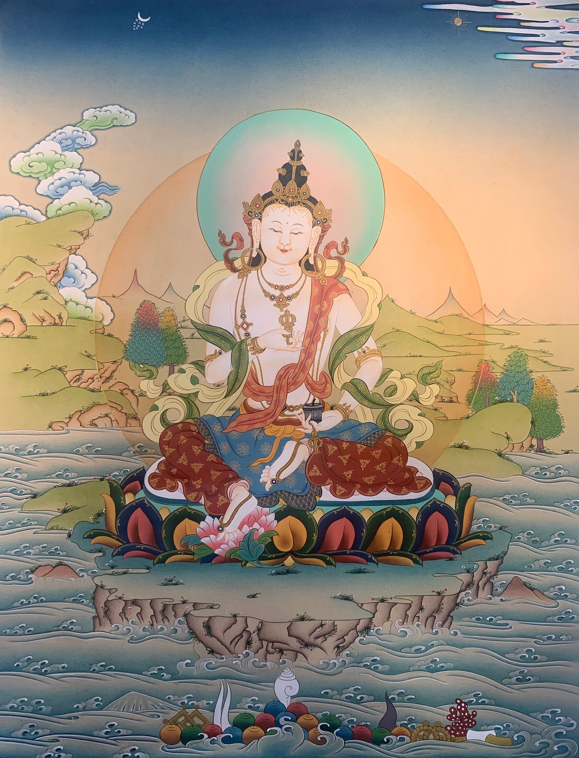 Vajrasattva is white in color, symbolising his impeccable purity. He holds a vajra in his right hand, a weapon used as a ritual object, that symbolises the properties of a diamond (indestructibility), and a thunderbolt (irresistible force). In his left hand he holds a Ghanta, a bell of wisdom. The sound of the bell is thought to call to mind the empty nature of all things, helping us to become free of attachment and aversion, liberated from the painful cycle of birth and death. He is depicted in full lotus, or vajra, position. He wears the exquisite silk robes and jewelled ornaments of ancient Indian royalty.