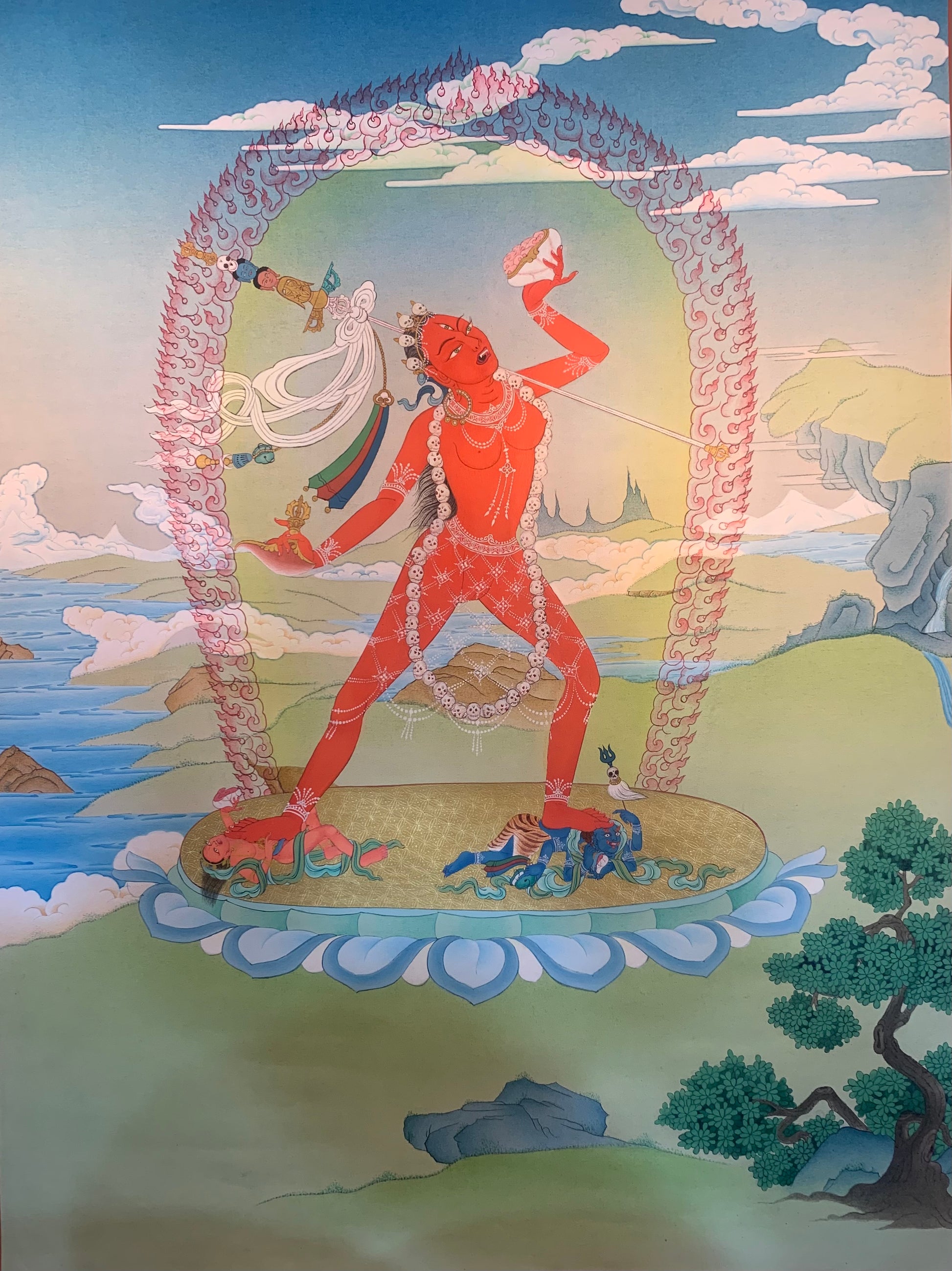 This beautiful hand painted Tibetan thangka painting depicts Vajrayogini རྡོ་རྗེ་རྣལ་འབྱོར་མ་. Vajrayogini is known as the Dakini of wisdom and depicted as red in color with a semi-wrathful expression. Vajrayogini is a representation of complete buddhahood in female form. She is classified as Wisdom or 'Mother' Anuttarayoga Tantra, the practices originate with the Chakrasamvara Cycle of Tantras. Vajrayogini found in a variety of forms and she is common to all schools of Tibetan Buddhism.