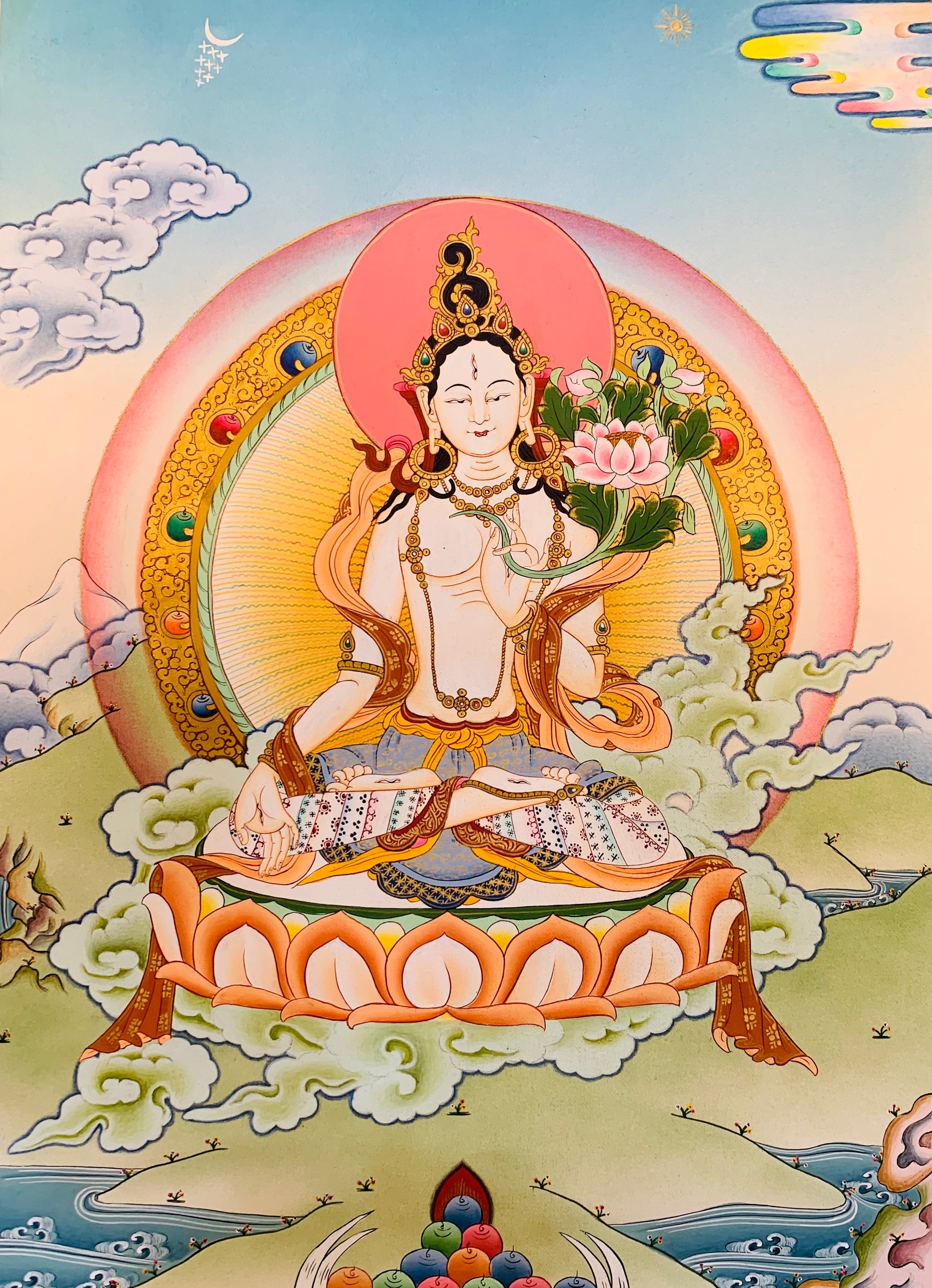 This beautiful hand painted Tibetan thangka painting depicts White Tara སྒྲོལ་དཀར།. White Tara (Sitatārā) is a Bodhisattva of compassion and action, associated with practices designed to lengthen one’s lifespan and to overcome life-threatening challenges. She is worshiped by practitioners of Vajrayana Buddhism to develop the qualities of compassion (karuṇā), loving-kindness (mettā) and emptiness (shunyata).