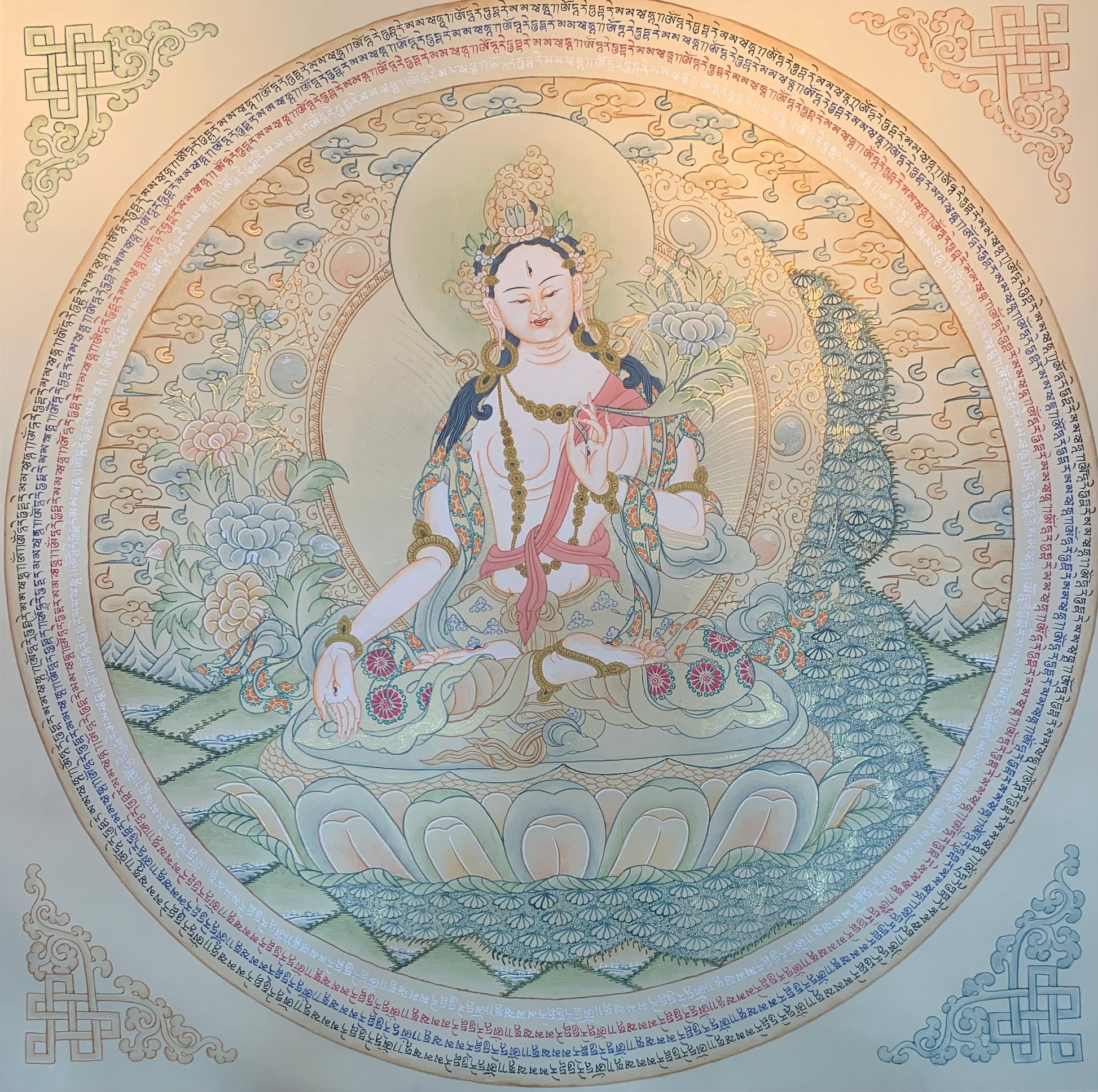 This White Tara Tibetan thangka painting is hand painted by master local artists in the Kathmandu Valley, Nepal. The Buddhist Thangka depicts a beautifully detailed White Tara thangka design and comes unframed and ready for Western style framing or with traditinal brocade. It is painted entirely by hand on cotton canvas using natural mineral and vegetable pigments with 24K gold details. The complicated designs, intricate brushstrokes, and extraordinary detail make these thangkas authentic works of art. A true masterpiece, this painting is the perfect addition to your home, meditation space, room shrine or altar space.