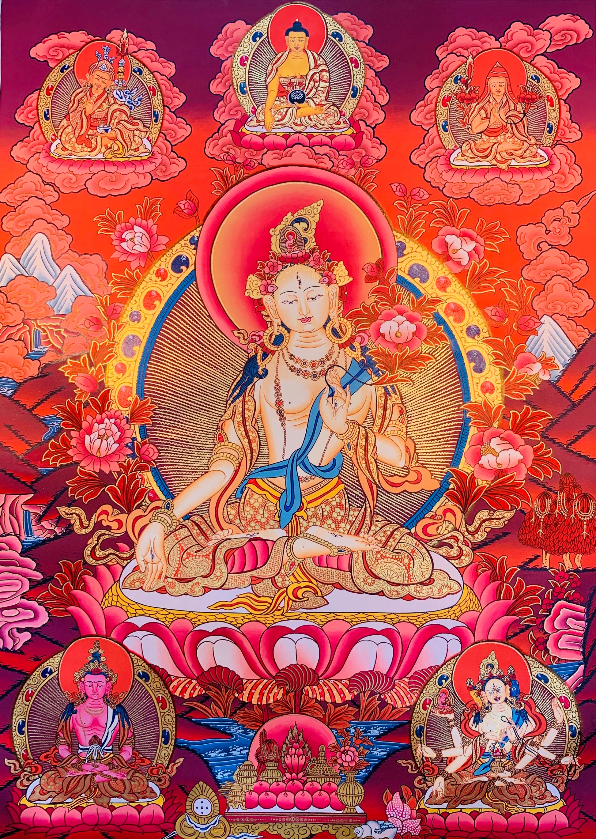 这幅美丽的手绘西藏唐卡画描绘了白度母སྒྲོལ་དཀར།。白度母 (Sitatārā) 是慈悲和行动的菩萨,与旨在延长寿命和克服危及生命的挑战的实践有关。她受到金刚乘佛教修行者的崇拜,以培养慈悲 (karuṇā)、慈 (metta) 和空性 (shunyata) 的品质。