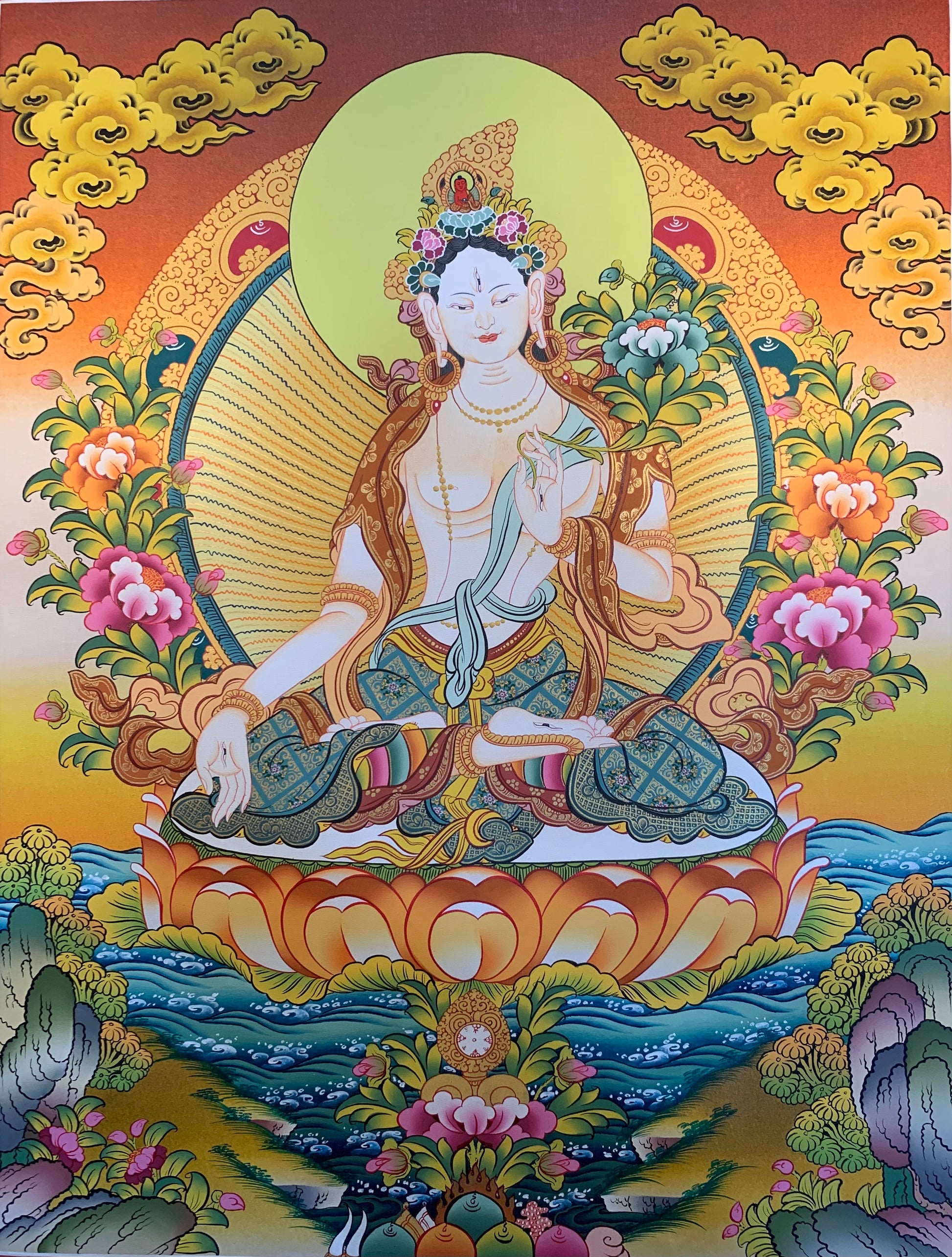 This beautiful hand painted Tibetan thangka painting depicts White Tara