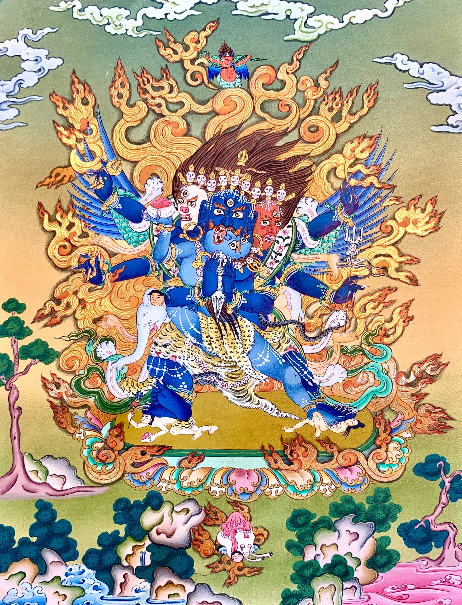 This beautiful hand painted Tibetan thangka painting depicts Vajrakilaya རྡོ་རྗེ་ཕུར་པ།, also known as Vajrakumara རྡོ་རྗེ་གཞོན་ནུ།. Vajrakilaya is a wrathful deity that embodies the enlightened activity of all the buddhas. His practice is known for being the most powerful for removing obstacles, destroying the negative forces hostile to compassion and purifying spiritual pollution. Vajrakilaya is also one of the eight forms of Heruka ཧེ་རུ་ཀ་.